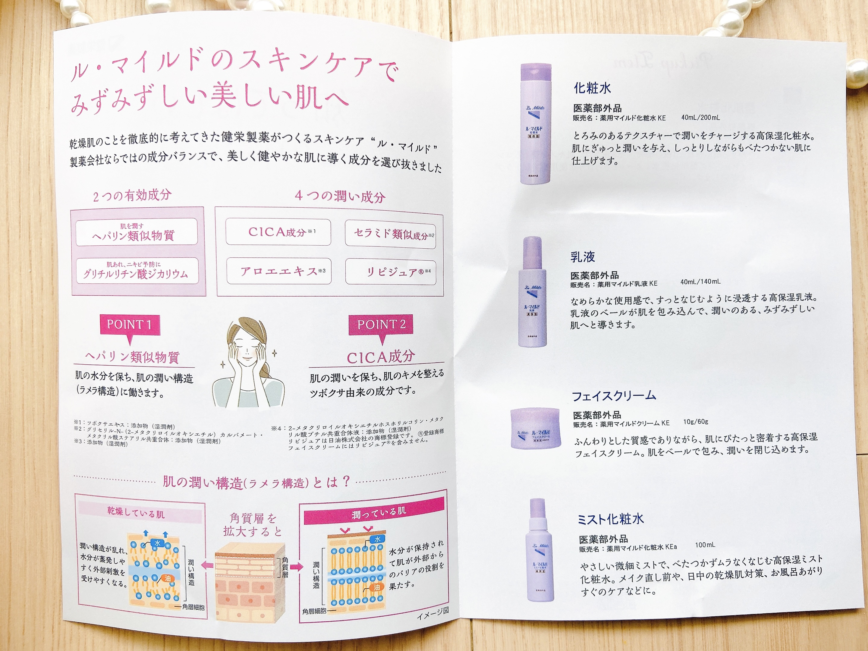 - <ル・マイルド化粧水> グリセリル-N-(2-メタクリロイルオキシエチル)カルバメート・メタクリル酸ステアリル共重合体、2-メタクリロイルオキシエチルホスホリルコリン・メタクリル酸ブチル共重合体液、ツボクサエキス、アロエエキス(2)、グリセリン、スクワラン、1,3 -ブチレングリコール、ポリエチレングリコール1500、L-ピロリドンカルボン酸、DL-ピロリドンカルボン酸ナトリウム液、濃グリセリン、カルボキシビニルポリマー、キサンタンガム、パラオキシ安息香酸プロピル、パラオキシ安息香酸メチル、pH調整剤、ヘパリン類似物質、グリチルリチン酸ジカリウム