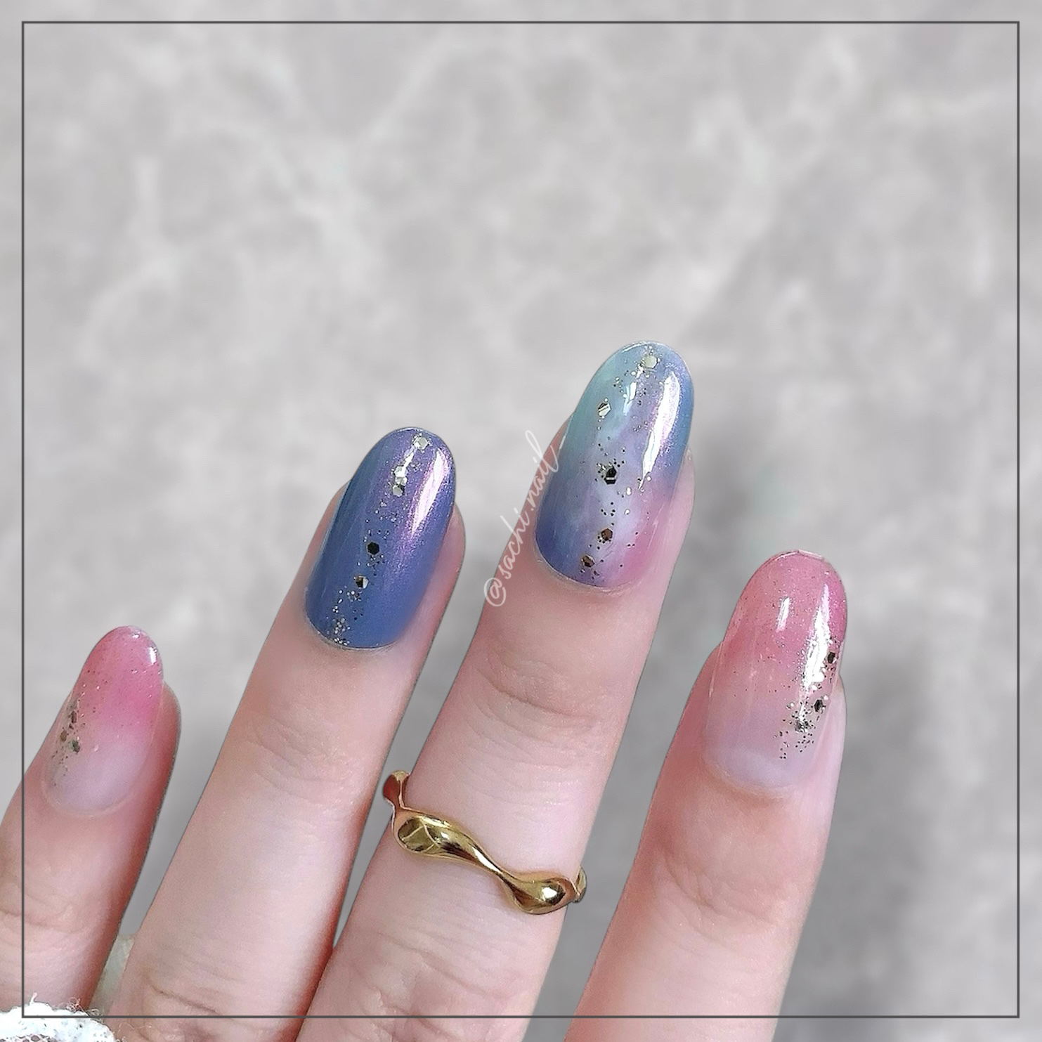 ワンカラーでも指ごとに色を変えるだけでオシャレに見えます💕 画像のようにゴールドラインとストーンを少し足すだけで華やかさがアップ🥰 何度かご紹介したことのあるスポンジで作るグラデーションです✨ スポンジを使うことで境目が綺麗に馴染んでくれます💕 アルミホイルの上でブラウンとトップコートを1:1くらいで混ぜたものを、トップコートのハケに取って3箇所に塗るだけ👌 事前に混ぜたものを塗ることで、爪の上でぼかすより簡単に出来ます💕 ベースカラーが乾く前に点置きしてぼかすことで綺麗にぼかせます✨ スピードが大事なので、使うポリッシュのキャップは全て開けておきましょう😊 天然石のラインはガタガタの方がより天然石っぽく見えるので、ラインを描くのが苦手な方でも大丈夫🙆♀️ 難しそうに見えて、やってみると意外と簡単に出来ます♡