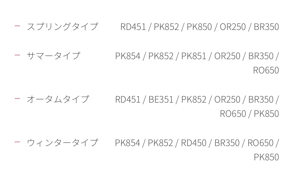 - <BE351 桃のはにかみ> ジフェニルジメチコン、デカエチルヘキサン酸ポリグリセリル-10、(VP/ヘキサデセン)コポリマー、イソドデカン、トリメチルシロキシフェニルジメチコン、テトラエチルヘキサン酸ペンタエリスリチル、トリイソステアリン酸ポリグリセリル-2、合成ワックス、ジメチコン、フェニルトリメチコン、イソステアリン酸デキストリン、DPG、トコフェロール、ヒアルロン酸Na、BHT、(エイコセン/ビニルピロリドン)コポリマー、(エチレン/プロピレン)コポリマー、カルナウバロウ、キャンデリラロウ、キャンデリラロウエステルズ、ジメチルシリル化シリカ、スクワラン、トリイソステアリン酸イソプロピルチタン、ハイドロゲンジメチコン、メチコン、水酸化Al、炭酸Ca、酸化チタン、酸化鉄、黄4、赤202 <BR350 林檎の口づけ> ジフェニルジメチコン、デカエチルヘキサン酸ポリグリセリル-10、(ビニルピロリドン/ヘキサデセン)コポリマー、イソドデカン、トリメチルシロキシフェニルジメチコン、テトラエチルヘキサン酸ペンタエリスリチル、トリイソステアリン酸ポリグリセリル-2、合成ワックス、ジメチコン、フェニルトリメチコン、イソステアリン酸デキストリン、DPG、トコフェロール、ヒアルロン酸Na、BHT、(エイコセン/ビニルピロリドン)コポリマー、(エチレン/プロピレン)コポリマー、アルミナ、カルナウバロウ、キャンデリラロウ、キャンデリラロウエステルズ、シリカ、ジメチルシリル化シリカ、スクワラン、ハイドロゲンジメチコン、炭酸Ca、酸化チタン、酸化鉄、黄4、赤202 <BR352 駆け引きワイン(限定)> ジフェニルジメチコン、デカエチルヘキサン酸ポリグリセリル-10、(VP/ヘキサデセン)コポリマー、イソドデカン、トリメチルシロキシフェニルジメチコン、テトラエチルヘキサン酸ペンタエリスリチル、合成ワックス、ジメチコン、フェニルトリメチコン、トリイソステアリン酸ポリグリセリル-2、イソステアリン酸デキストリン、DPG、トコフェロール、ヒアルロン酸Na、BHT、(エイコセン/ビニルピロリドン)コポリマー、(エチレン/プロピレン)コポリマー、アルミナ、カルナウバロウ、キャンデリラロウ、キャンデリラロウエステルズ、シリカ、ジメチルシリル化シリカ、スクワラン、ハイドロゲンジメチコン、炭酸Ca、酸化チタン、酸化鉄、黄4、赤202 <OR250 海星の恋心> ジフェニルジメチコン、デカエチルヘキサン酸ポリグリセリル-10、(ビニルピロリドン/ヘキサデセン)コポリマー、イソドデカン、トリメチルシロキシフェニルジメチコン、トリイソステアリン酸ポリグリセリル-2、テトラエチルヘキサン酸ペンタエリスリチル、合成ワックス、ジメチコン、フェニルトリメチコン、イソステアリン酸デキストリン、DPG、トコフェロール、ヒアルロン酸Na、BHT、(エイコセン/ビニルピロリドン)コポリマー、(エチレン/プロピレン)コポリマー、アルミナ、カルナウバロウ、キャンデリラロウ、キャンデリラロウエステルズ、シリカ、ジメチルシリル化シリカ、スクワラン、ハイドロゲンジメチコン、炭酸Ca、酸化チタン、酸化鉄、黄4、赤202 <PK850 うさぎの恋人> ジフェニルジメチコン、デカエチルヘキサン酸ポリグリセリル-10、(ビニルピロリドン/ヘキサデセン)コポリマー、イソドデカン、トリメチルシロキシフェニルジメチコン、テトラエチルヘキサン酸ペンタエリスリチル、トリイソステアリン酸ポリグリセリル-2、合成ワックス、ジメチコン、フェニルトリメチコン、イソステアリン酸デキストリン、DPG、トコフェロール、ヒアルロン酸Na、BHT、(エイコセン/ビニルピロリドン)コポリマー、(エチレン/プロピレン)コポリマー、アルミナ、カルナウバロウ、キャンデリラロウ、キャンデリラロウエステルズ、シリカ、ジメチルシリル化シリカ、スクワラン、ハイドロゲンジメチコン、炭酸Ca、酸化チタン、酸化鉄、黄4、赤202 <PK851 わがままな肉球> ジフェニルジメチコン、デカエチルヘキサン酸ポリグリセリル-10、(ビニルピロリドン/ヘキサデセン)コポリマー、イソドデカン、トリメチルシロキシフェニルジメチコン、テトラエチルヘキサン酸ペンタエリスリチル、トリイソステアリン酸ポリグリセリル-2、合成ワックス、ジメチコン、フェニルトリメチコン、イソステアリン酸デキストリン、DPG、トコフェロール、ヒアルロン酸Na、BHT、(エイコセン/ビニルピロリドン)コポリマー、(エチレン/プロピレン)コポリマー、アルミナ、カルナウバロウ、キャンデリラロウ、キャンデリラロウエステルズ、シリカ、ジメチルシリル化シリカ、スクワラン、ハイドロゲンジメチコン、炭酸Ca、酸化チタン、酸化鉄、黄4、赤202 <PK852 桜の微笑み> ジフェニルジメチコン、デカエチルヘキサン酸ポリグリセリル-10、(VP/ヘキサデセン)コポリマー、イソドデカン、トリメチルシロキシフェニルジメチコン、テトラエチルヘキサン酸ペンタエリスリチル、合成ワックス、トリイソステアリン酸ポリグリセリル-2、ジメチコン、フェニルトリメ