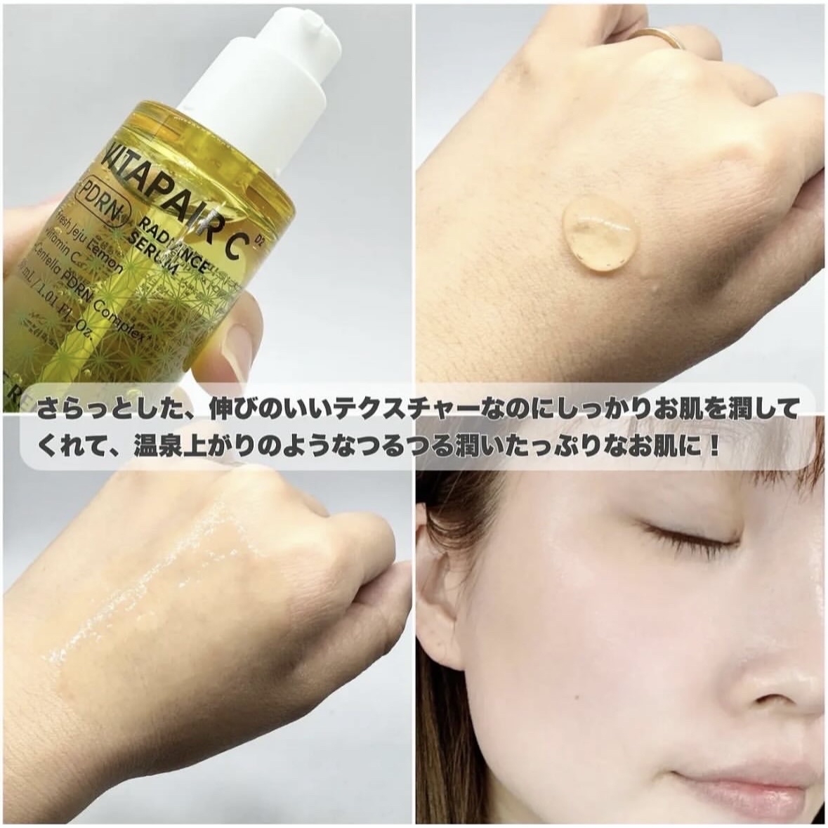 - センテラPDRNとビタミンC成分により敏感肌や荒れたお肌をやさしく鎮静しながら、温泉上がりのような透明感と潤いをプラス。 さらにナイアシンアミドや、済州グリーンレモン水※1でくすみやシミをケアし、健やかな肌へと導きます。 高濃度なスキンケアが苦手な方や敏感肌の方でも毎日使いやすい、デイリーケアにぴったりの低刺激セラムです。 【こんな方におすすめ】 ・お肌のハリや弾力が気になる方 ・敏感肌で高濃度製品を使用することに抵抗がある方 ・毎日続けられて着実にお肌の潤いと弾力ケアができる商品を探している方