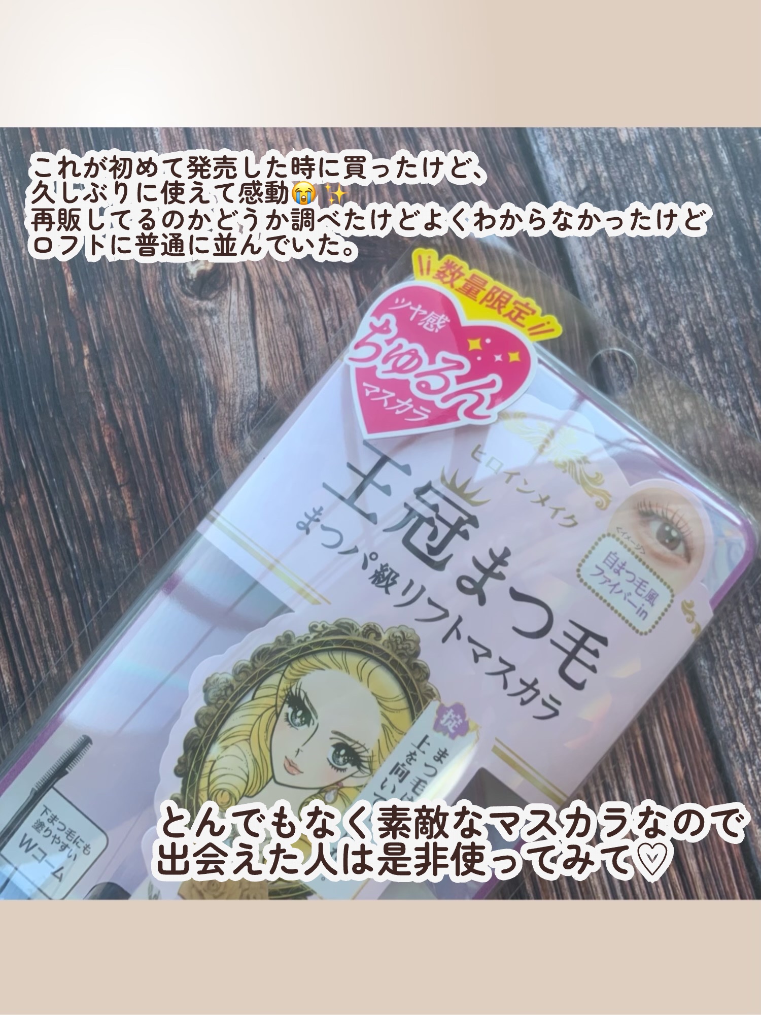 - 数量限定発売 ぐいっとまつパ級のリフト力で1日中※1カールキープ!ちゅるんとツヤ感&束感のある「王冠まつ毛」を叶えるコームマスカラが数量限定登場 ■まつパ級リフト、1日中※1キープ! まつ毛パーマのように根元から立ち上がり、毛先までダマなく美しい「王冠まつ毛」に。下まつ毛・目頭にも塗りやすいWコーム採用。 ■1日中※1カールキープ カールロック成分配合。塗った瞬間上向きカールを強力固定します。 ※1 日中の活動時間 ■スーパー級※2ウォータープルーフ 長時間にじまない!涙・汗・皮脂・こすれに強い独自の耐久処方。 ※2 ヒロインメイク マスカラ内で ■2種類の自まつ毛風ファイバーで軽やかロングへ 軽やかな仕上がりのエアリータッチファイバーと黒よりもやわらかい色味のナチュラルグレーファイバーを絶妙にMiX! 自まつ毛になじみやすく、自然なロングまつ毛に仕上げます。 ■濡れたようなツヤ感のゼリーブラック ちゅるんとしたツヤ感のある半透明な黒色で、軽やかなのに存在感のあるまつ毛に。 グロッシーパール配合できらめきをプラス。 ■6種のまつ毛美容液成分配合 ツバキオイル・ローヤルゼリーエキス・アルガンオイル ・野バラオイル※3・オタネニンジンエキス・アーモンドオイル(まつ毛保護成分) ※3 カニナバラ果実油