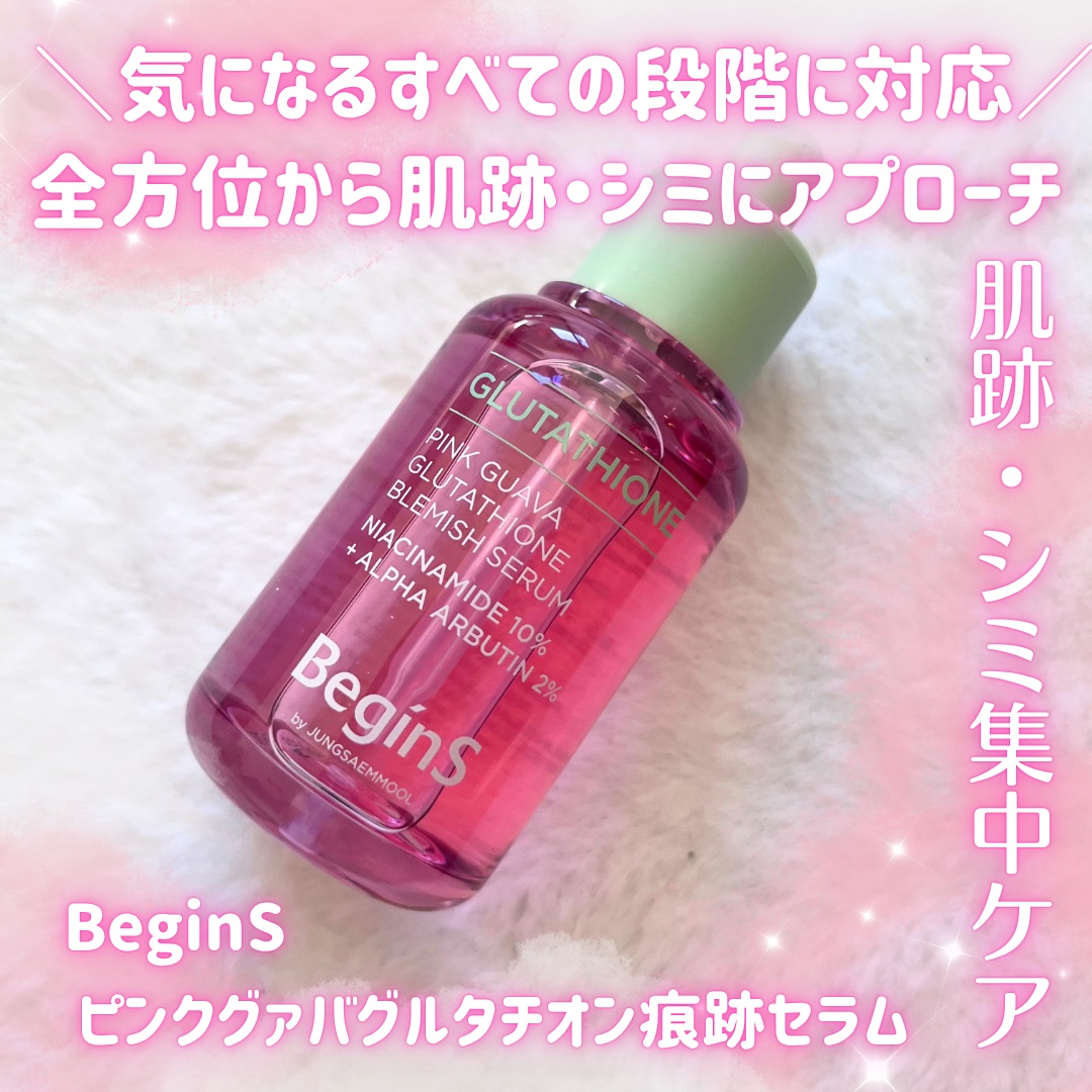 Beginsピンクグァバグルタチオン痕跡セラム色素沈着・シミ・トラブル跡純度99%グルタチオンピンクグアバ抽出物アルファーアルブチンナイアシンアミドビタミンツリーウォーターニキビ跡になりやすいので悩んでいました💦ややとろみのあるテクスチャー嫌...