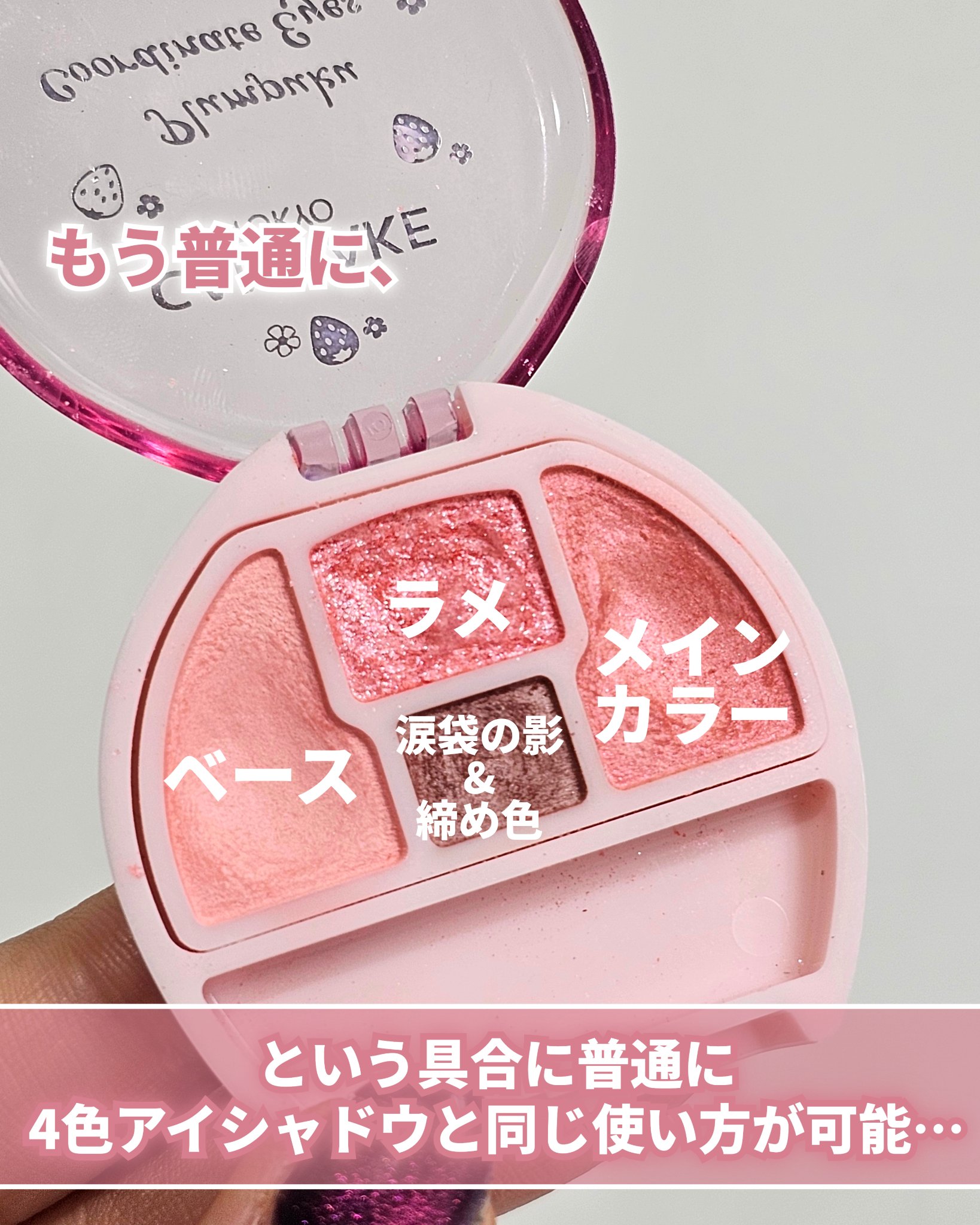 全体のローズ感と粉質もたまらなくいいんですが 左下のハイライトカラー?パールの粉が すんごい涙袋にいいんですよ… パーンとめちゃくちゃ涙袋盛れるけど、 ほんのりピンクがかった白みベージュなので 平成ギャルみたいになるわけではない…と思う ほんとこのハイライトカラーが涙袋に良すぎて いつかここだけ底見えする説…