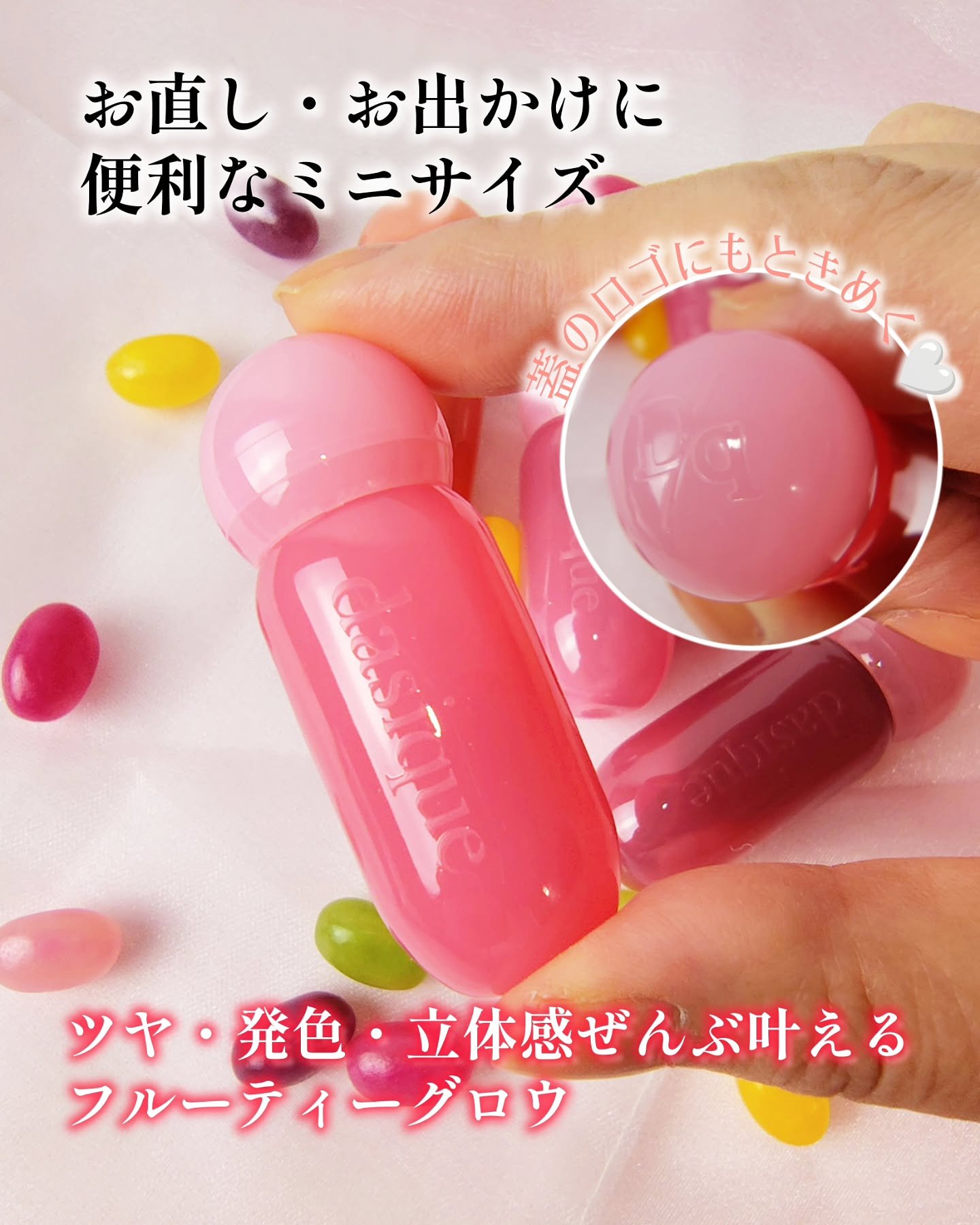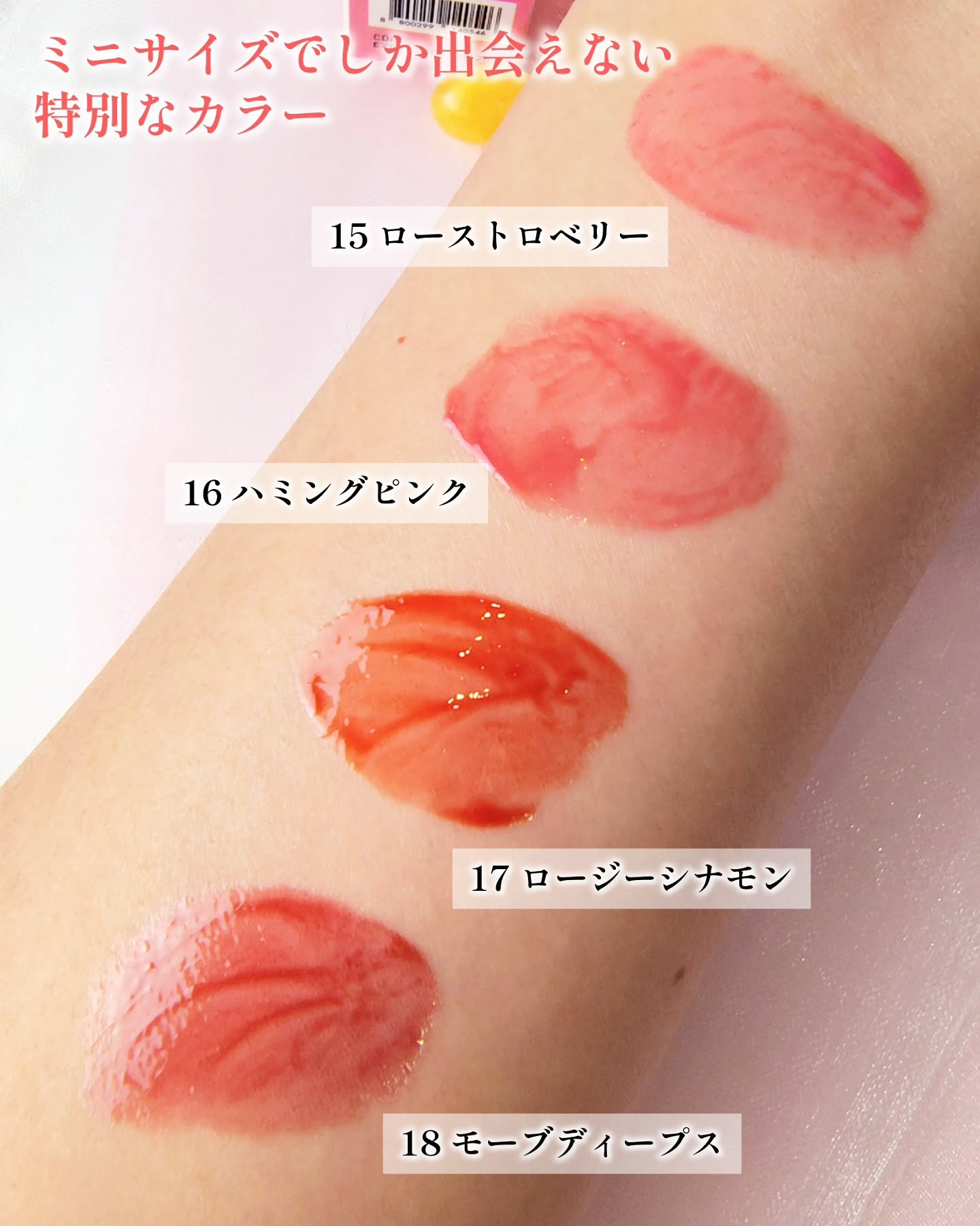 - 【夏新作2カラー登場!】 まるで果実のしずくがそのままリップになったような、みずみずしさと繊細なツヤを詰め込んだ「ジュージーデューイグロウティント」 夏新作で登場する新色「ベリーハート」、「タロミルク」は、透明感とふんわりとした色づきを徹底的にこだわって、何度もテストを重ねて生まれた特別なクールトーンカラー。 ひと塗りで唇をうるおし、重ねても重くならず、果実たっぷり!光をまとうような仕上がりに! - 蜂蜜に漬けた果物のように、うるちゅるふっくらとした果汁粘膜「ジューシーデュイグロウティント」 ミニだけの限定4色 15 ローストロベリー 16 ハミングピンク 17 ロージーシナモン 18 モーブディープス ♡唇に触れた途端、ぷるんと色っぽい果汁コーティング 果汁コーティングがじゅわっと唇に広がり、透明に輝くうるちゅる感を!蜂蜜に漬けた果物のようにぷるんぷるんとした唇を演出するグロウティント ♡イエベ、ブルべに合わせた多彩なカラーバリエーション 14色のカラーバリエーションで単独または、2色レイヤーリングして様々なリップメイクを演出 ♡ティント+リップグロスを一気に塗る効果! ティントの鮮やかな発色とリップグロスのうるうる透明ツヤ感が何度塗り重ねてもべたつかせず、唇にピタッと密着! 2025年11月1日(土)より、Qoo10公式ショップおよび東京フラッグシップストアにて発売予定