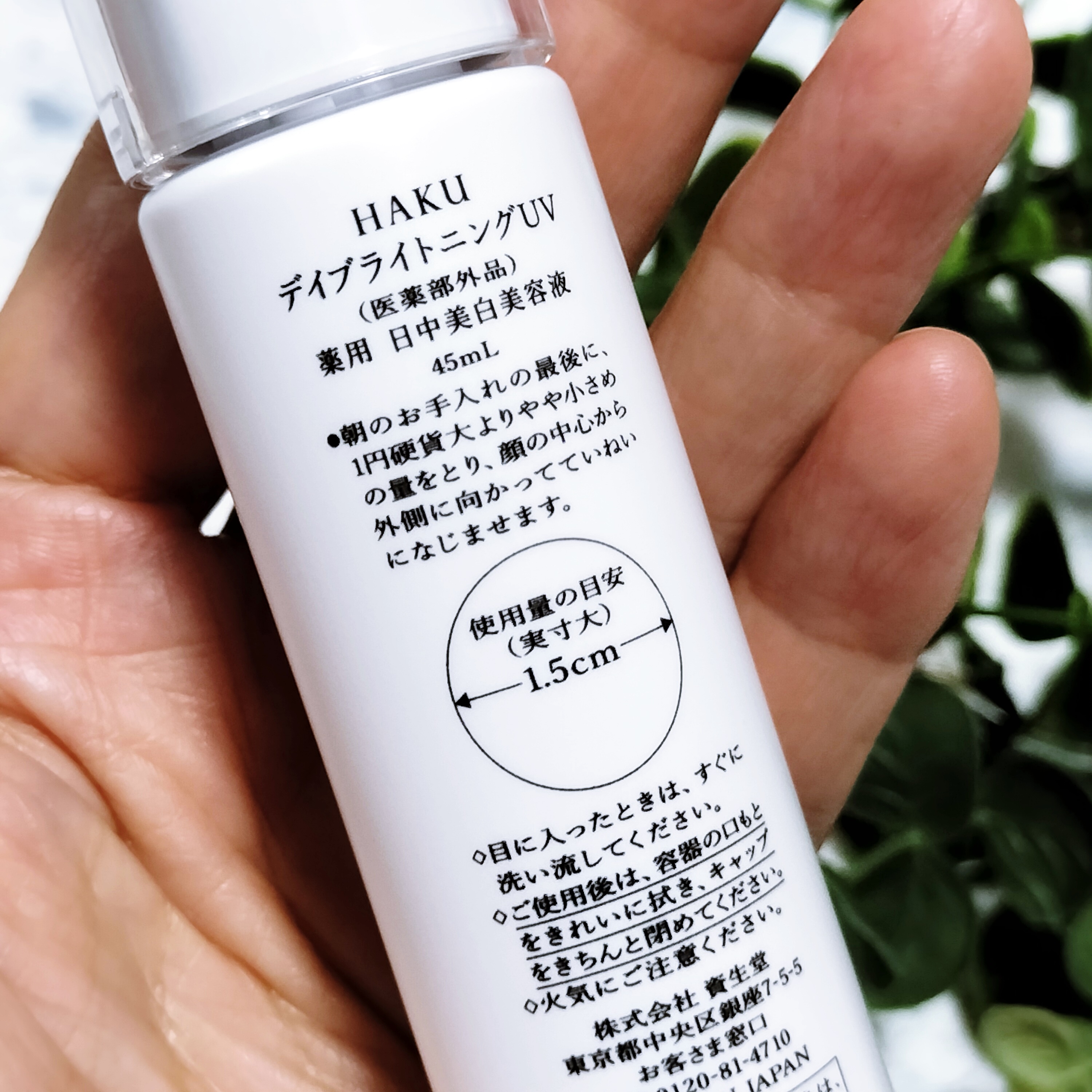 - 【医薬部外品】 (HAKU デイブライトニングUV) SPF50+・PA++++ シミができる日中環境のメラニン生成ルートに着目。 シミ予防研究の先端技術を搭載。 日中の「シミリスク」から守る徹底したケアによる肌管理。肌奥まで届け効かせる2種の美白有効成分がメラニンの生成を抑え、シミ・そばかすを防ぐ、日中の「シミリスク」ケア。 薬用 日中美白美容液UV。 「美発光肌」で輝き続ける。 乾燥による小ジワを目立たなくします。(効能評価試験済み) みずみずしく広がりしっとりなめらかな使用感