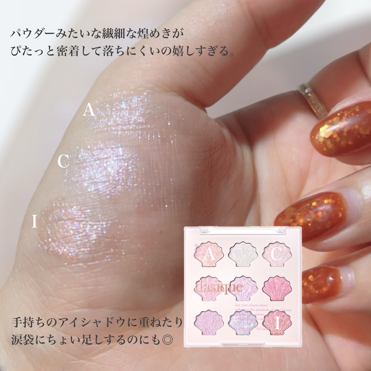 - 【舞台上のバレリーナの繊細な動きと抑制された美しさを再解釈した、dasiqueならではのバレエコアコレクション】 シマー、マット、パールなどバリエーション豊かなテクスチャーで、軽やかにまぶたにフィット。粉飛びしにくく、指先で簡単に美しい仕上がりが叶います。 柔らかいピンクベースから深みのあるシェードまで揃い、1つのパレットで普段使いのデイリーメイクから特別な日の華やかメイクまで幅広く楽しめます。 - 活用しやすいテクスチャーとカラーバリエーションで毎日新しいムードを完成してくれるデイジーク シャドウパレット。 デイリーメイクからポイントメイクまで演出が可能。 感覚的な9種類の色味でムードUP! 多彩でウェアラブルなテクスチャーで高い活用度!