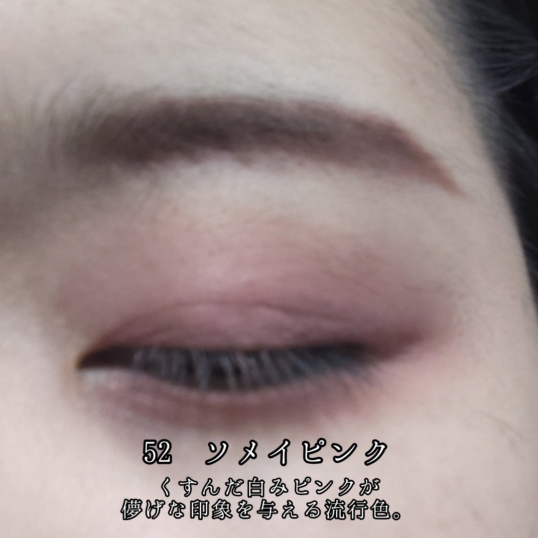 濃すぎない透け発色で、グラデーションも簡単に作れます! 02の水桃ミラージュって名前が、乃木坂46の大園桃子ちゃんを連想する名前で可愛いなって個人的に思いました🍑 52はグラデーションを使ったり、他のアイシャドウとかと合わせて使っても良さそうです!