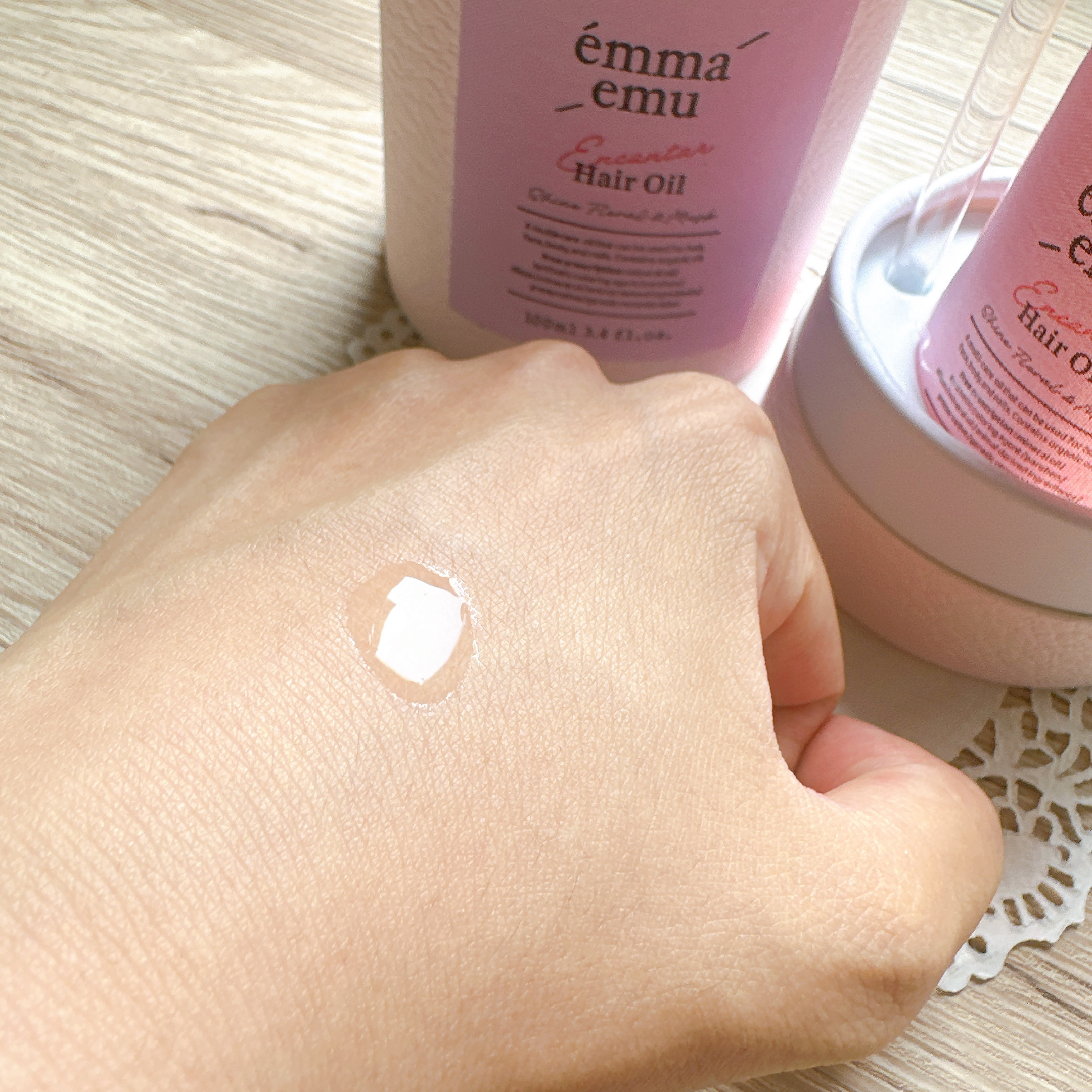- ■天然由来成分99%使用、髪・肌・体に使えるマルチオイル 「emma emu encantar hair oil(エマエミュー エンカンタールヘアオイル)」は、99%天然由来成分でできており、髪や肌に優しく、スタイリングはもちろんタオルドライ後のヘアケアやボディケアとしても使えるマルチオイルスタイリング剤。パサつく髪に潤いを与え、ツヤと柔らかさを兼ね備えたスタイリングを演出します。華やかな” Shine Floral & Musk(シャインフローラル&ムスク)”、上品な” Peony & Musk(ピオニー&ムスク)”の2種の香り。艶やかな髪を長時間キープします。