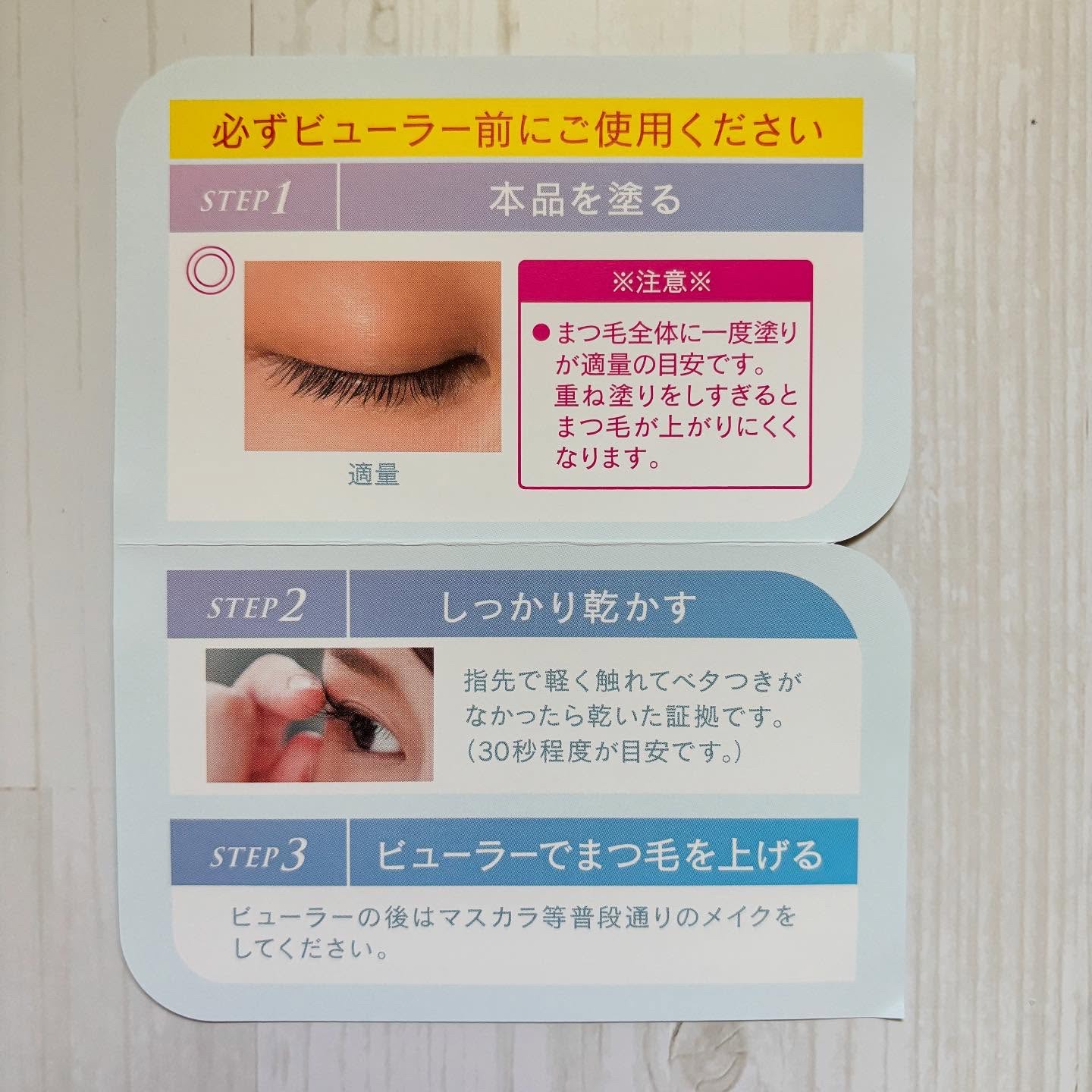- まつ毛メイクの新時代到来! 【まるで1DAYまつ毛パーマ®】 「メイクでまつ毛パーマができれば!」 開発者のそんな思いから誕生。 ビューラー前の使用で“まつ毛パーマしたて”のような仕上がりを実現。 機能①:カールアップ力 ビューラー前に使用することでまつ毛が上がりやすくなる。 機能②:カールキープ力 ビューラーで付けるカールを記憶する「スタイリングメモリー*成分」配合で仕上がりを長時間キープ。 *洗い流されるまでの一時的な効果 機能③:まつ毛の向きを整える バラつきまつ毛の向きを整え、コーティング。綺麗な扇状まつ毛に仕上がる。 ★まつ毛パーマ取れかけのバラバラまつ毛も綺麗に整うため、まるでまつ毛パーマしたてのような仕上がりになります。