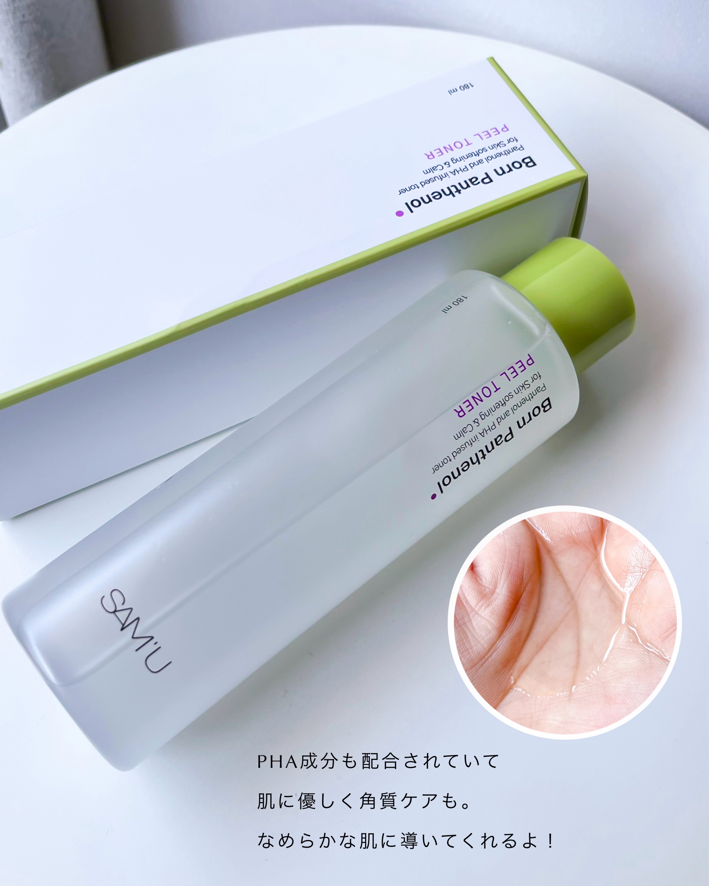 #PRサミュ(SAM'U)【ボーンパンテノールピールトナー】洗顔後の肌にすっとなじむ、みずみずしいテクスチャーが心地よい。さっぱりとした使用感ながら、肌表面がしっとりと整うような印象を受けました。フレッシュフローラルの香りがふんわりと広がり、...