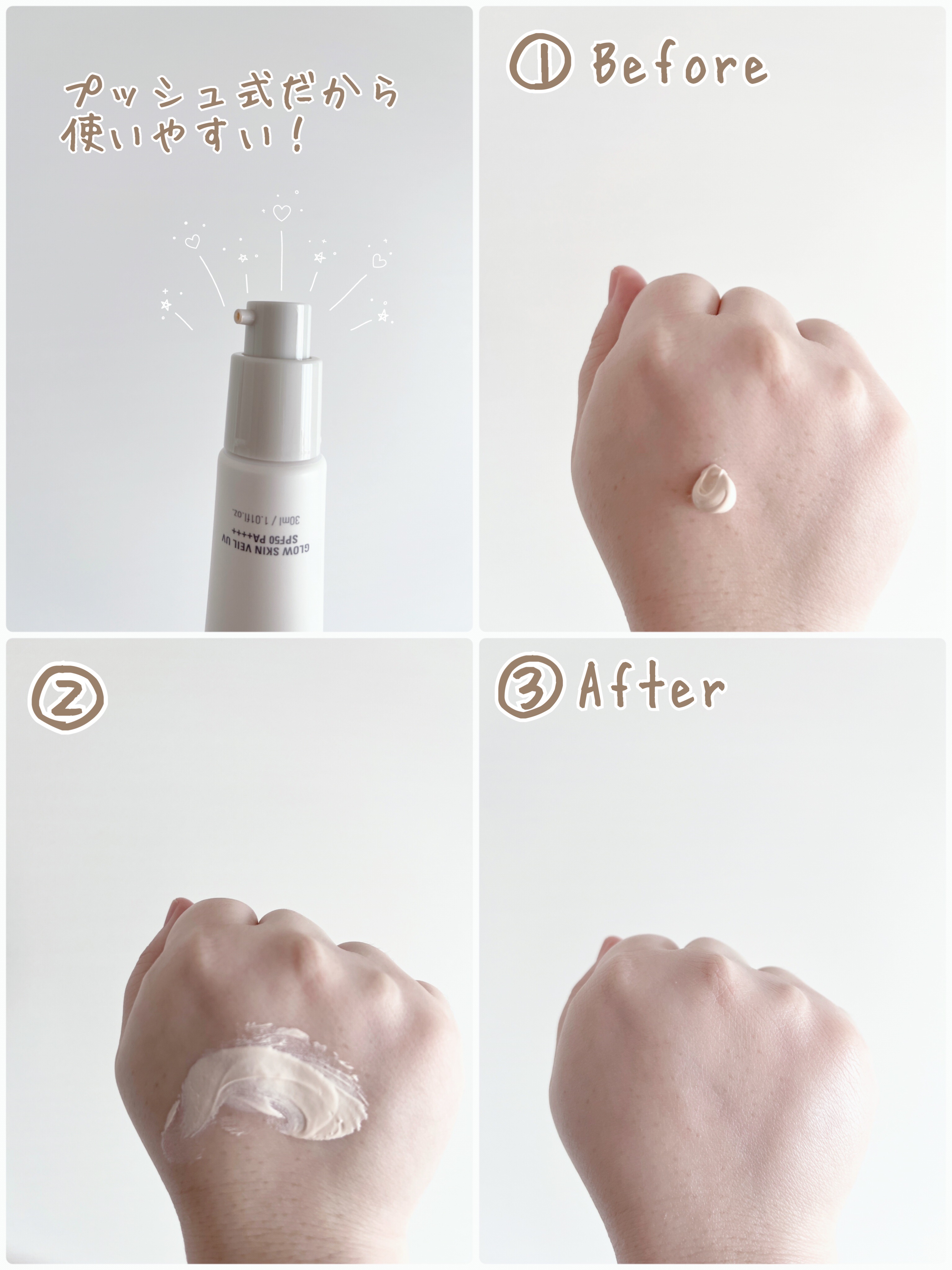 - POINT01:GLOW──たっぷりの水分で、透き通るようなツヤを。 心地よいみずみずしさと透明感*¹を追求し、ウォータリーベースにこだわりました。ヘルシーなツヤを肌から引き出しながら、アロエベラやヤマイモのエキスからなるスムースモイストコンプレックス*²が、日中の肌をさわやかに保湿します。インナードライ肌の対策にもおすすめです。 *¹うるおいによって肌に明るい印象をもたらすこと *²アロエベラ葉エキス、マコンブエキス、ヤマノイモ根エキス、ウルムスダビディアナ根エキス、スミレ花エキス(すべて整肌成分) POINT02:SKIN VEIL──肌の引き締めやテカリの悩みにアプローチし、ベースメイクを格上げ。 ファンデーションの仕上がりを左右するのは、肌の「なめらかさ」と「さらさら状態」がキープできるかどうか。肌の引き締めが気になる肌をケアするスムースモイストコンプレックス*¹と、皮脂吸着パウダー*²のシナジーで、下地効果で肌表面をカバーすることにより毛穴や凹凸の気にならない、するするとなめらかな肌状態を作ります。ファンデーションが薄膜できれいに乗り、その美しさが持続する肌へと整えます。 *¹アロエベラ葉エキス、マコンブエキス、ヤマノイモ根エキス、ウルムスダビディアナ根エキス、スミレ花エキス(すべて整肌成分) *²メタクリル酸メチルクロスポリマー(整肌成分) POINT03:UV──紫外線吸収剤不使用なのに、透明感*¹のある軽やかな仕上がり。 海でのレジャーも思い切り楽しめるよう、紫外線吸収剤不使用にこだわりました。2種のミネラルパウダー*²を絶妙な割合で配合し、白浮きやきしみを感じさせないスキンケアのような使用感と、SPF50 PA++++の実現を両立。強烈な日差しの日も、肌をしっかりとガードします。 *¹メーキャップ効果による *²酸化亜鉛、酸化チタン(すべて整肌成分)