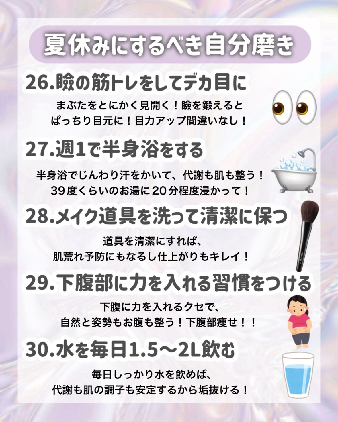【瞼の筋トレ】について詳しく解説!!これさえすれば絶対変われます!!!瞼の筋トレって?という方は、画像をご覧下さい‼️これがないと私は今頃二重になってなかった…と言っても過言ではないくらい、私の癖付けには欠かせなかったものです!!今回は、昔からしている筋トレ1つと、最近思いついて実践している筋トレ2つをご紹介します!!どれもすごく簡単なので、ぜひ試してみてください📷Q 一日どのくらいしてた?A とにかく暇さえあればしていました!!1日30分の日もあれば、何時間もする日もありましたこの筋トレは、お風呂に入りながらや勉強しながら、スマホ見ながらでもできるのがいいところなので、スキマ時間を上手く活用するのがいいかな思います💭Q 今まで何回くらい筋肉痛になった?A 左右どちらも5回くらいだと思います!瞼が私より軽い方は、1、2回で十分スッキリすると思いますよ❣️Q どれくらいで筋肉痛になった?A 筋肉痛までは平均して2週間くらいかかりました!でもフォロワーさんの中には1日でなられた方も多くいらっしゃいますなのでその人の瞼や頑張り次第だと思います❣️Q 筋トレ1