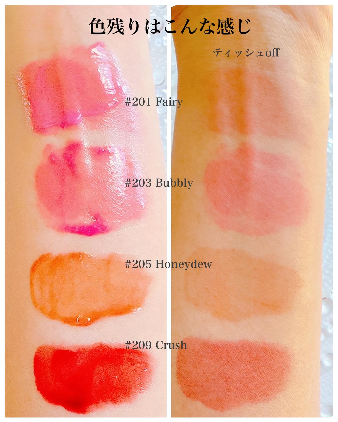 - <201 フェアリー> ダイマージリノール酸ジイソステアリル、ジフェニルシロキシフェニルトリメチコン、ビスジグリセリルポリアシルアジペート-2、水、ジフェニルジメチコン、水添ポリイソブテン、セチルPEG/PPG-10/1ジメチコン、ポリソルベート60、ペンチレングリコール、グリセリン、イソステアリン酸ポリグリセリル-4、フェノキシエタノール、1,2-ヘキサンジオール、セテアレス-20、酸化チタン (CI 77891)、(アクリル酸ヒドロキシエチル/アクリロイルジメチルタウリンNa)コポリマー、ステビオシド、スクワラン、香料、ジラウラミドグルタミドリシンNa、エチルヘキシルグリセリン、エチレンジアミンジコハク酸3Na、赤色227号 (CI 17200)、水酸化Al、黄色5号 (CI 15985)、ポリアクリル酸アンモニウム、イソステアリン酸ソルビタン、黄色4号 (CI 19140)、BG、赤色223号 (CI 45410)、青色1号 (CI 42090)、アラントイン、パンテノール、ツボクサエキス、ヒアルロン酸、加水分解ヒアルロン酸、ヒアルロン酸Na <203 バブリー> ダイマージリノール酸ジイソステアリル、ジフェニルシロキシフェニルトリメチコン、ビスジグリセリルポリアシルアジペート-2、水、ジフェニルジメチコン、水添ポリイソブテン、セチルPEG/PPG-10/1ジメチコン、ポリソルベート60、ペンチレングリコール、グリセリン、イソステアリン酸ポリグリセリル-4、フェノキシエタノール、1,2-ヘキサンジオール、セテアレス-20、(アクリル酸ヒドロキシエチル/アクリロイルジメチルタウリンNa)コポリマー、ステビオシド、酸化チタン (CI 77891)、スクワラン、香料、ジラウラミドグルタミドリシンNa、エチルヘキシルグリセリン、赤色227号 (CI 17200)、エチレンジアミンジコハク酸3Na、黄色5号 (CI 15985)、イソステアリン酸ソルビタン、水酸化Al、ポリアクリル酸アンモニウム、黄色4号 (CI 19140)、BG、青色1号 (CI 42090)、アラントイン、パンテノール、ツボクサエキス、ヒアルロン酸、加水分解ヒアルロン酸、ヒアルロン酸Na <204 レア> ダイマージリノール酸ジイソステアリル、ジフェニルシロキシフェニルトリメチコン、ビスジグリセリルポリアシルアジペート-2、水、ジフェニルジメチコン、水添ポリイソブテン、セチルPEG/PPG-10/1ジメチコン、ポリソルベート60、ペンチレングリコール、グリセリン、イソステアリン酸ポリグリセリル-4、フェノキシエタノール、1,2-ヘキサンジオール、セテアレス-20、(アクリル酸ヒドロキシエチル/アクリロイルジメチルタウリンNa)コポリマー、酸化チタン (CI 77891)、ステビオシド、スクワラン、香料、ジラウラミドグルタミドリシンNa、エチルヘキシルグリセリン、赤色227号 (CI 17200)、黄色5号 (CI 15985)、エチレンジアミンジコハク酸3Na、イソステアリン酸ソルビタン、水酸化Al、ポリアクリル酸アンモニウム、黄色4号 (CI 19140)、青色1号 (CI 42090)、BG、アラントイン、パンテノール、ツボクサエキス、ヒアルロン酸、加水分解ヒアルロン酸、ヒアルロン酸Na <205 ハニーデュー> ダイマージリノール酸ジイソステアリル、ジフェニルシロキシフェニルトリメチコン、ビスジグリセリルポリアシルアジペート-2、水、ジフェニルジメチコン、水添ポリイソブテン、セチルPEG/PPG-10/1ジメチコン、ポリソルベート60、ペンチレングリコール、グリセリン、イソステアリン酸ポリグリセリル-4、フェノキシエタノール、1,2-ヘキサンジオール、セテアレス-20、(アクリル酸ヒドロキシエチル/アクリロイルジメチルタウリンNa)コポリマー、酸化チタン (CI 77891)、ステビオシド、スクワラン、香料、ジラウラミドグルタミドリシンNa、エチルヘキシルグリセリン、赤色227号 (CI 17200)、黄色5号 (CI 15985)、エチレンジアミンジコハク酸3Na、イソステアリン酸ソルビタン、水酸化Al、ポリアクリル酸アンモニウム、黄色4号 (CI 19140)、青色1号 (CI 42090)、BG、アラントイン、パンテノール、ツボクサエキス、ヒアルロン酸、加水分解ヒアルロン酸、ヒアルロン酸Na <206 トフィー> ダイマージリノール酸ジイソステアリル、ジフェニルシロキシフェニルトリメチコン、ビスジグリセリルポリアシルアジペート-2、水、ジフェニルジメチコン、水添ポリイソブテン、セチルPEG/PPG-10/1ジメチコン、ポリソルベート60、ペンチレングリコール、グリセリン、イソステアリン酸ポリグリセリル-4、フェノキシエタノール、1,2-ヘキサンジオール、セテアレス-20、(アクリル酸ヒドロキシエチル/アクリロイルジメチルタウリンNa)コポリマー、ステビオシド、スクワラン、香料、ジラウラミドグルタミドリシンNa、酸化チタン (CI 77891)、エチルヘキシルグリセリン、黄色5号 (CI 15985)、エチレンジアミンジコハク酸3Na、黄色4号 (CI 19140)、赤色227号 (CI 17200)、イソステアリン酸ソルビタン、赤色223号 (CI 45410)、青色1号 (CI 42090)、水酸化Al、ポリアクリル酸アンモニウム、BG、アラントイン、パンテノール、ツボクサエキス、ヒアルロン酸、加水分解ヒアルロン酸、ヒアルロン酸Na <207 フレイム> ダイマージリノール酸ジイソステアリル、ジフェニルシロ