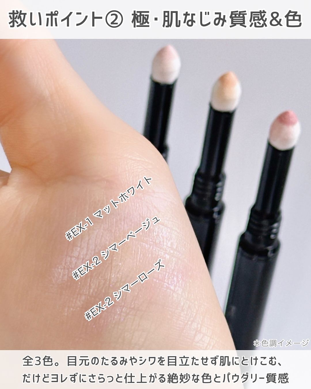 - <EX-1 マットホワイト> トリメチルシロキシケイ酸、メチルトリメチコン、合成フルオロフロゴパイト、リンゴ酸ジイソステアリル、合成ワックス、ジフェニルシロキシフェニルトリメチコン、シリカ、キャンデリラロウ、トコフェロール、(+/-)マイカ、酸化チタン、酸化鉄、水酸化Al、酸化スズ、ホウケイ酸(Ca/Al)、黄4、赤202 <EX-2 シマーベージュ> トリメチルシロキシケイ酸、メチルトリメチコン、合成フルオロフロゴパイト、リンゴ酸ジイソステアリル、合成ワックス、ジフェニルシロキシフェニルトリメチコン、シリカ、キャンデリラロウ、トコフェロール、(+/-)マイカ、酸化チタン、酸化鉄、水酸化Al、酸化スズ、ホウケイ酸(Ca/Al)、黄4、赤202 <EX-3 シマーローズ> トリメチルシロキシケイ酸、メチルトリメチコン、合成フルオロフロゴパイト、リンゴ酸ジイソステアリル、合成ワックス、ジフェニルシロキシフェニルトリメチコン、シリカ、キャンデリラロウ、トコフェロール、(+/-)マイカ、酸化チタン、酸化鉄、水酸化Al、酸化スズ、ホウケイ酸(Ca/Al)、黄4、赤202