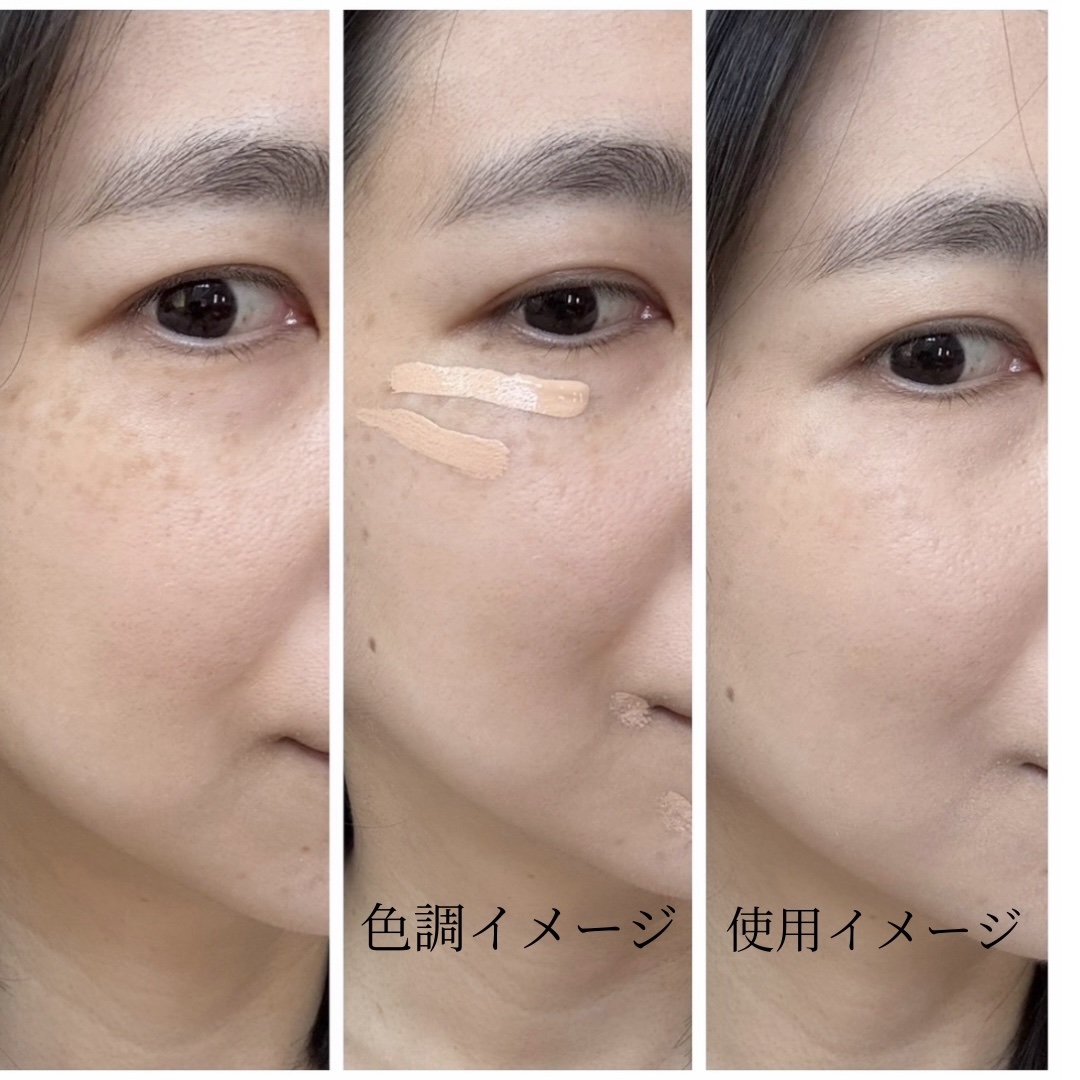 沈み込むタイプのやわらかいスポンジです。チョンととるだけでいいカバー力なので、ふたの裏でつける量を調節。 頬の高い部分から伸ばし、外側へ伸ばしていきます。さらにカバーしたい悩みのあるところに、重ねつけ。 ①オークル やや明るめ〜中間的な明るさ ナチュラルで落ち着いたカラー。暗めの色合いなのでパウダーで調節しています。