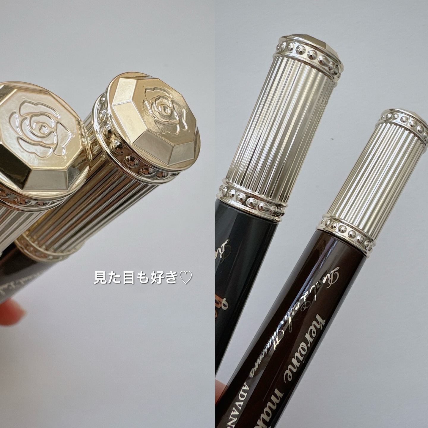 可愛すぎるピンクブラウンアイライナー💗 ピンクとブラウンが絶妙なバランスでまつ毛のある部分は少し陰り、延長ラインはしっかりカラーが主張💗 柔らかすぎない色味だからぼやっとすることなく丁度よく引き締めてくれる! 02ミディアムブラウン、07アズキブラウンで濃いなー、と思う人 15カプチーノピンクで淡すぎるかもー、と思った人にオススメです💪