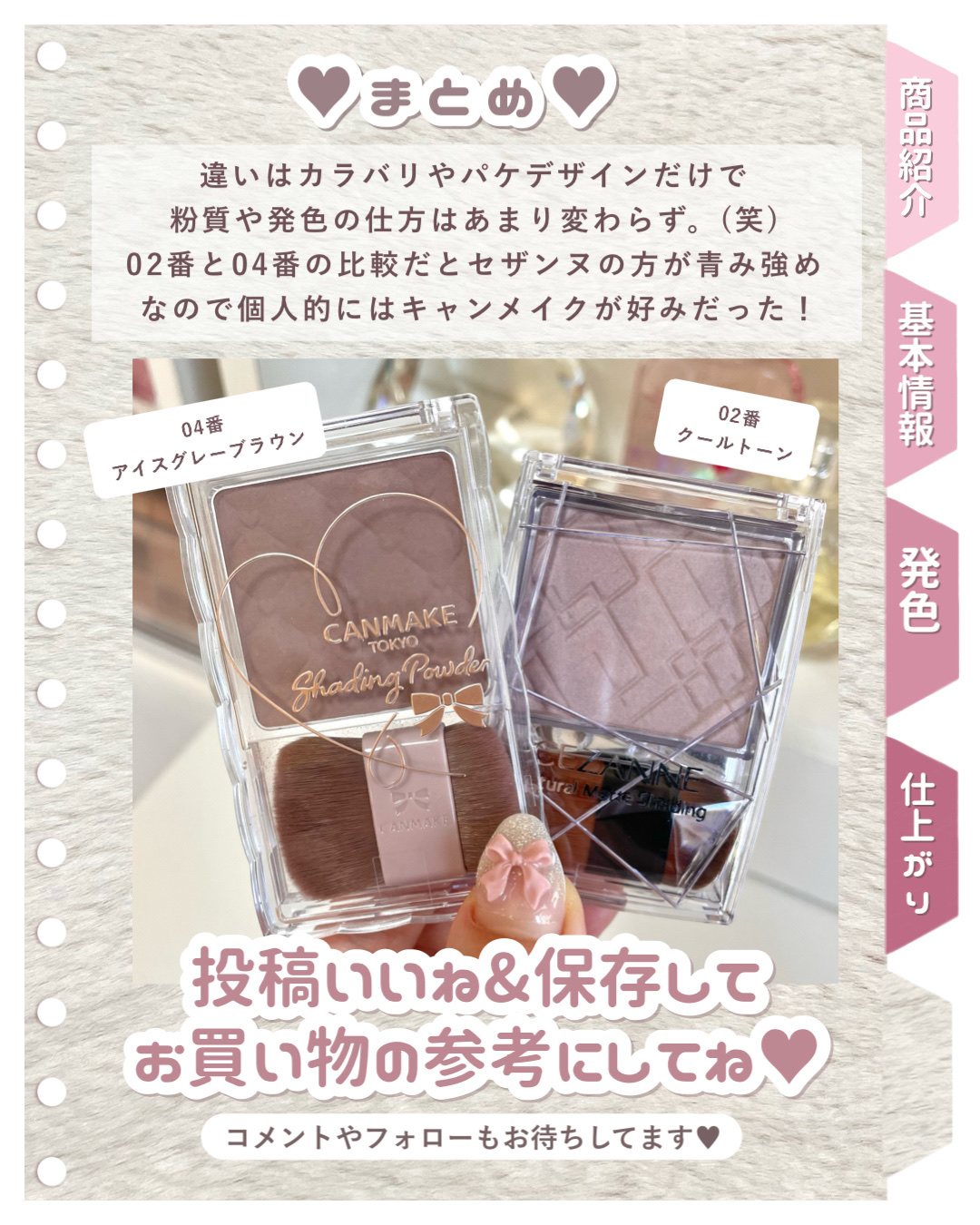 #購入品キャンメイクシェーディングパウダー04アイスグレーブラウンブルベ向けのシェーディングということで購入しましたが、ブルベ夏2ndイエベ春の私には赤みが強く感じてしまいました。1st、2nd共にブルベの方の方がお似合いになるかと思います。...