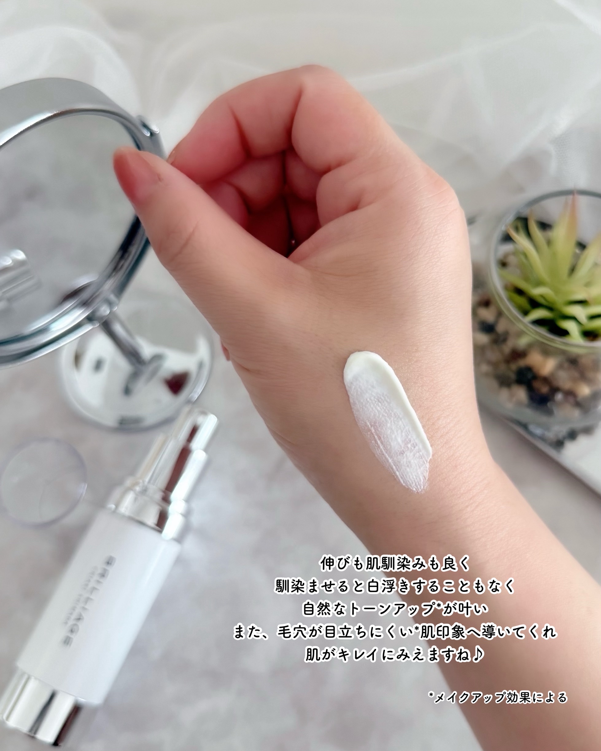 化粧下地としても日焼け止めとしてもとても優秀な肌印象を格上げしてくれる最強UVプライマー✨✨✨ 真っ白なプライマーは、ふわっとしたスフレのようなテクスチャー🩵 伸びがよくサラっとした使い心地で気持ちがいいです😍 「SPF50+・PA++++」とUV効果も高いのがありがたいです✨ 毛穴レス*な肌になりたい方に試してほしいハイスペックなプライマー&UVプロテクターです✨