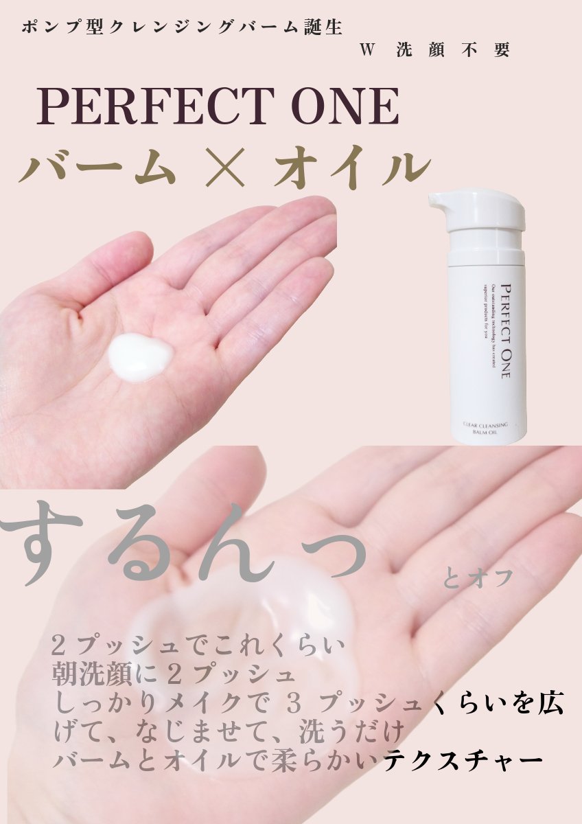 オイルとバームのいいとこどり。パーフェクトワン「クリアクレンジングバームオイル」! プッシュタイプの柔らかいバーム。プッシュで出てくるので、柔らかいバームが、メイク汚れと馴染みやすくて、使いやすいです。 ダブル洗顔不要で、ざらつきが気になる朝も使ってます。