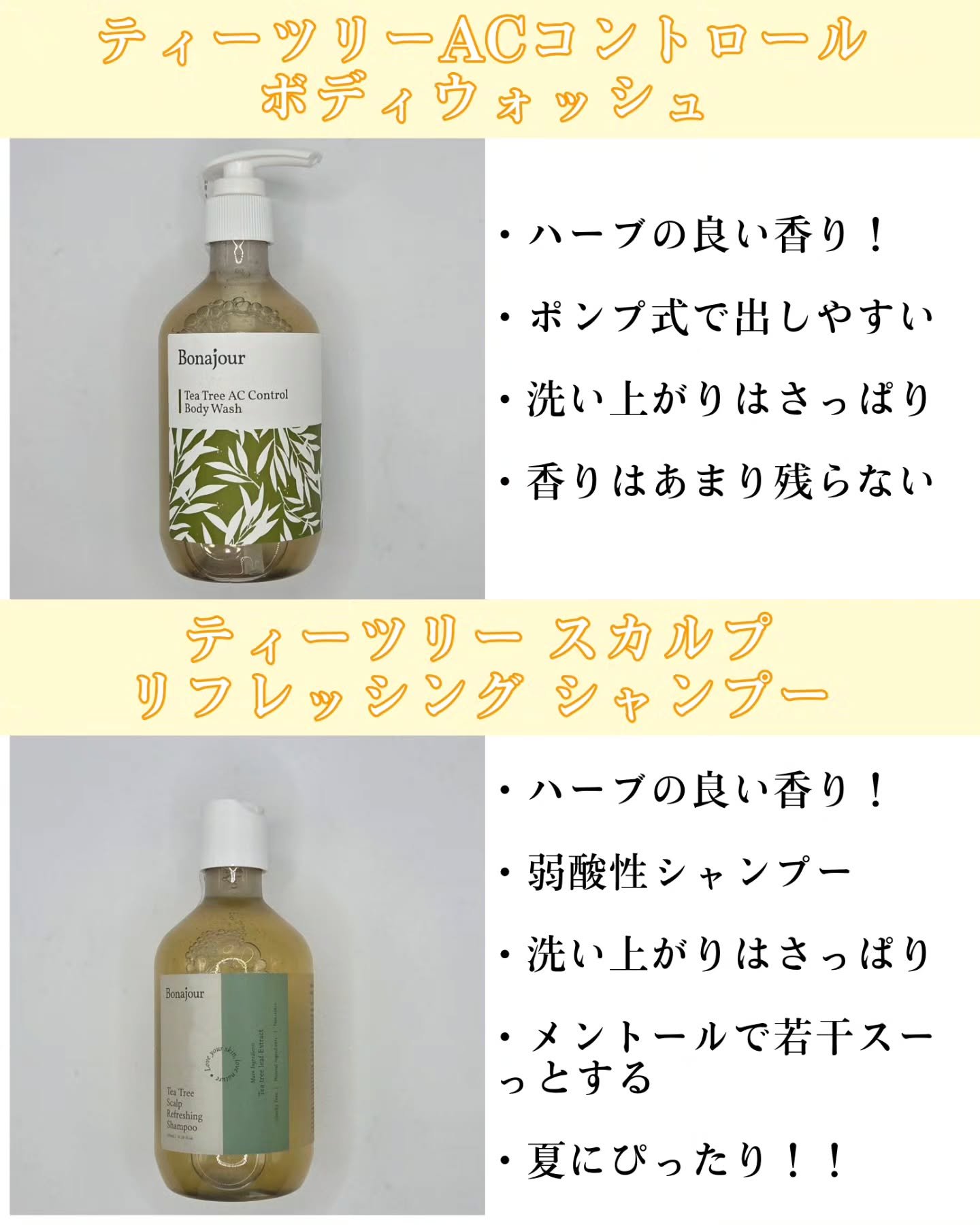 ボナジュールアンバサダーとしての初投稿です🤍💚ティーツリーACコントロールボディウォッシュ💚ティーツリースカルプリフレシングシャンプー🧡ゆずビタスキンブースター🤎ジンジャーアクアリリーフサンクリームどれもさっぱり軽い使用感で今の季節使いやすい...