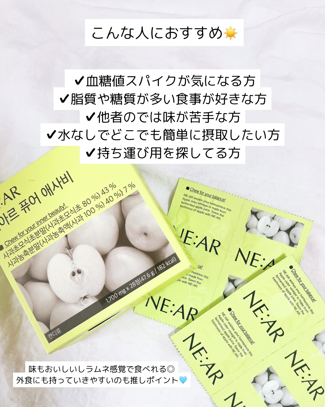 **こんばんは!美容大好きむうです!今回は食後にさっぱり美味しくダイエットサポートが出来るキャンディーを紹介するよ🍎ニアルのアップルサイダービネガーアップルサイダービネガーそのものの味で、少ししゅわしゅわして酸味があってとっても美味しいよ😋ア...