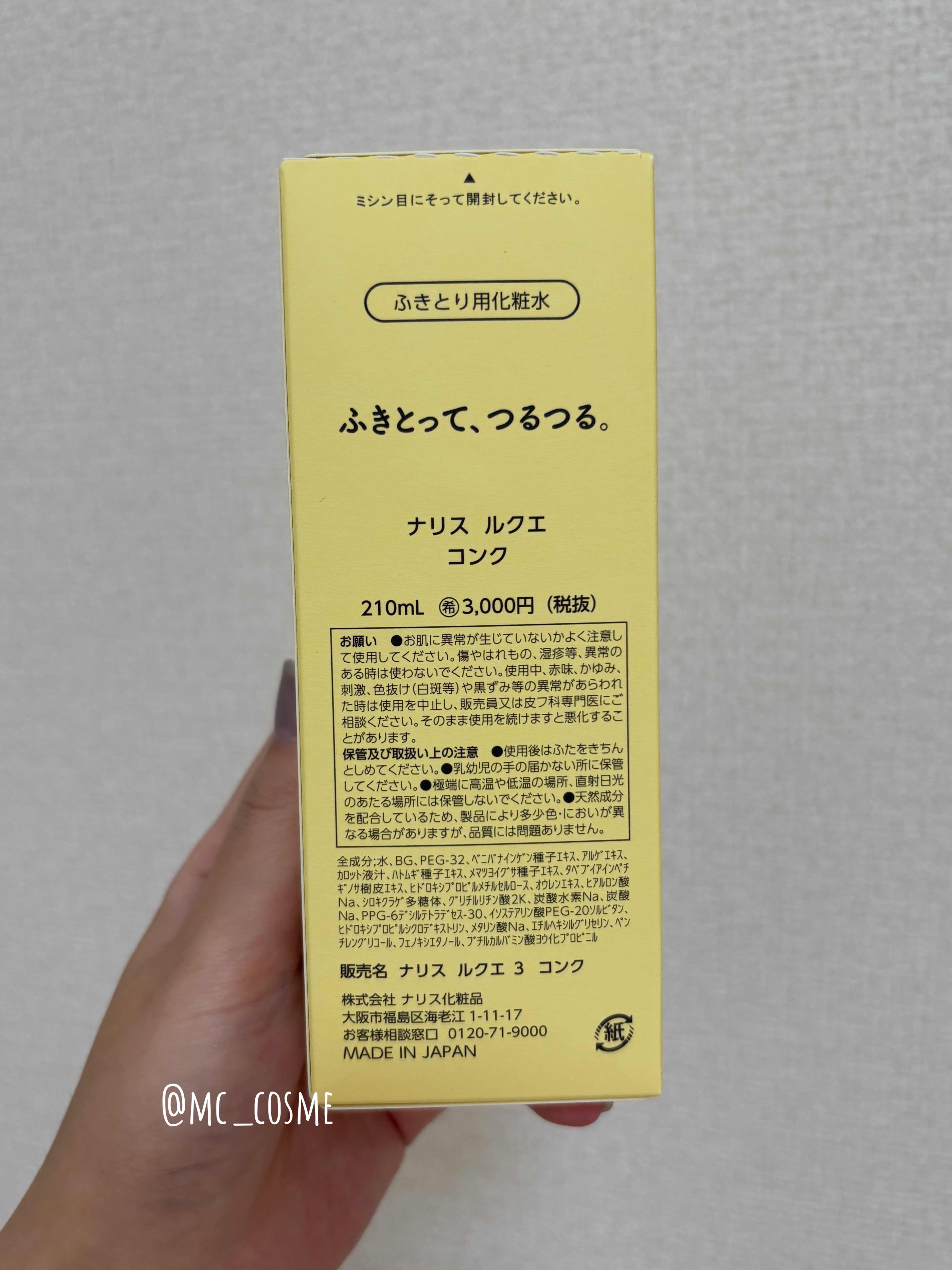 - ■毛穴、ザラつき、くすみ※1が気になる方に、不要な角質をふきとって、つるんとなめからかな肌へ。 ナリスのふきとり化粧水は、5年連続国内売上シェアNO.1※2 肌にとって余分な老化角質をおだやかに取り除き、素肌が持つ本来の美しさを引き出すルクエのコンク(ふきとり用化粧水)はナリスの80年以上続く研究開発によって誕生しました。 ●キレイのこたえは、ふきとり化粧水という選択。 植物保湿成分で古い角質をやさしくオフして、次に使うスキンケアアイテムのなじみをサポート。日々変化する肌をすこやかに整えます。毎日の“ふきとり習慣”で理想の肌に近づきましょう。 ●厳選した3つの植物の力で角層ケアをサポート。 ・柔らかくほぐして、取り除きやすくする「ヨクイニンエキス」※3 ・潤いを与え、健康的な角層へ導く「月見草エキス」※4 ・潤いを逃さず閉じ込める「白花豆エキス」※5 【使用方法】 1. 朝晩2回、洗顔後の後に。 2. コットンに8〜10滴程度(500円玉大)を含ませます。目安は、コットン裏側に染み込む程度。 3. できるだけ力を入れずに、やさしくなでるように顔全体を拭き取ります。 ※1古い角質による ※2ナリス化粧品 2015~2019年度 「ふきとり用化粧水」販売動向調査 TPCマーケティングリサーチ株式会社調べ※3 ハトムギ種子エキス(保湿成分) ※4 メマツヨイグサ種子エキス(保湿成分) ※5ベニバナインゲン種子エキス(保湿成分)