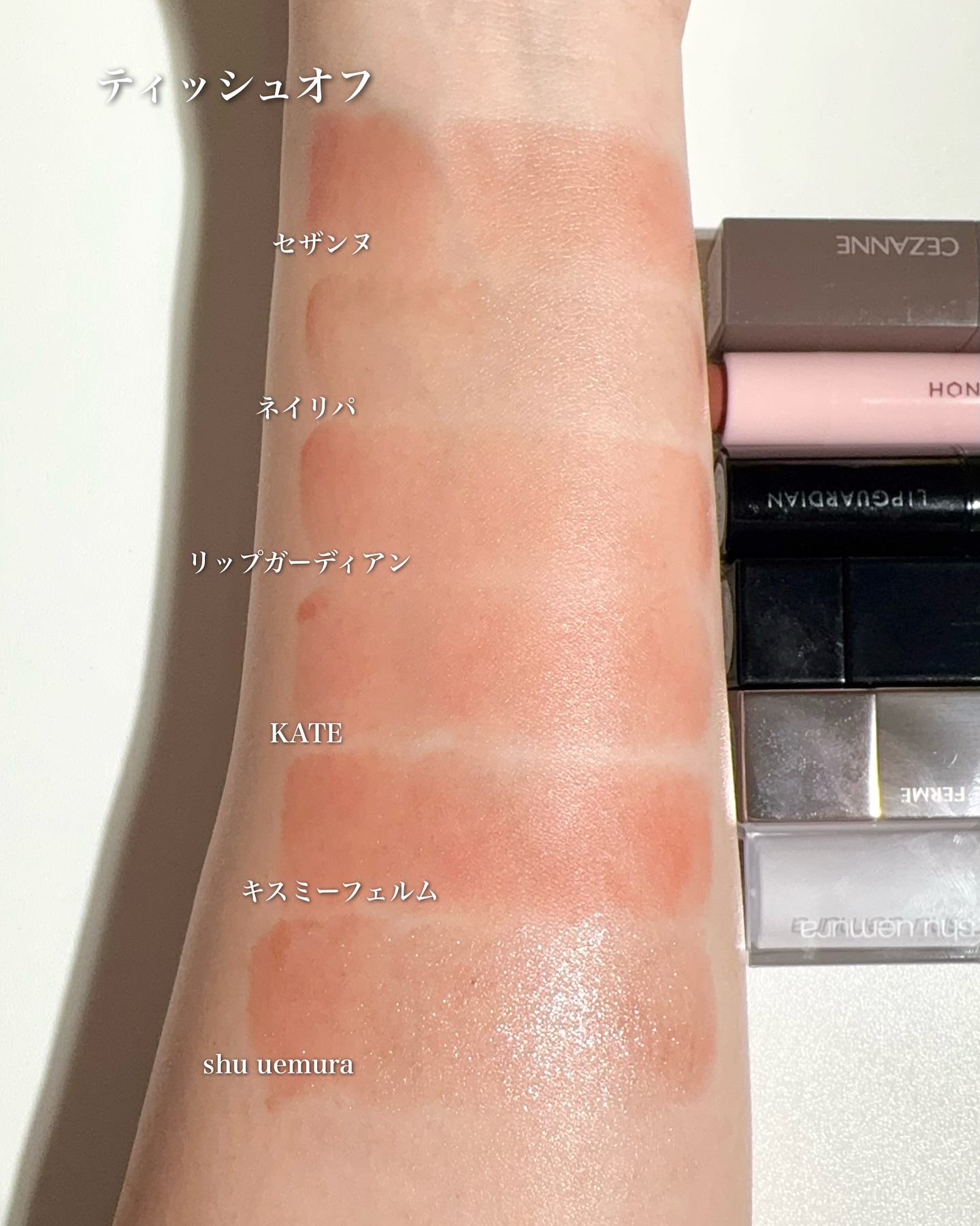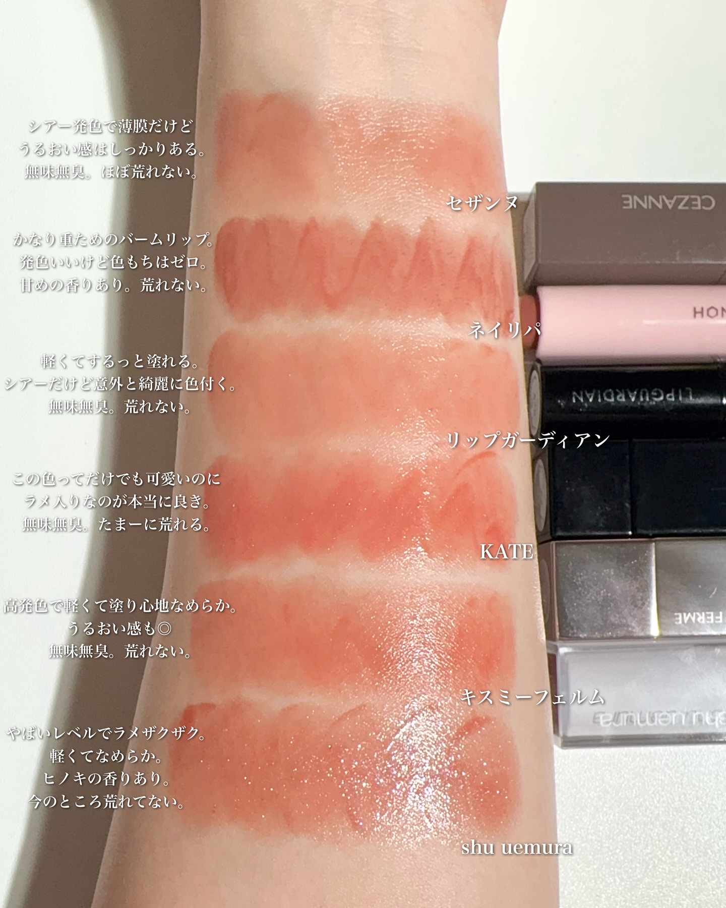ねっちょりボリューム感あるテクスチャーだけど、ベタつきなく使いやすい。 ティントじゃない普通のグロスだから色もちは良くない。 発色ナチュラルだからこれだけでもいいけど、他のリップと合わせても可愛い!!