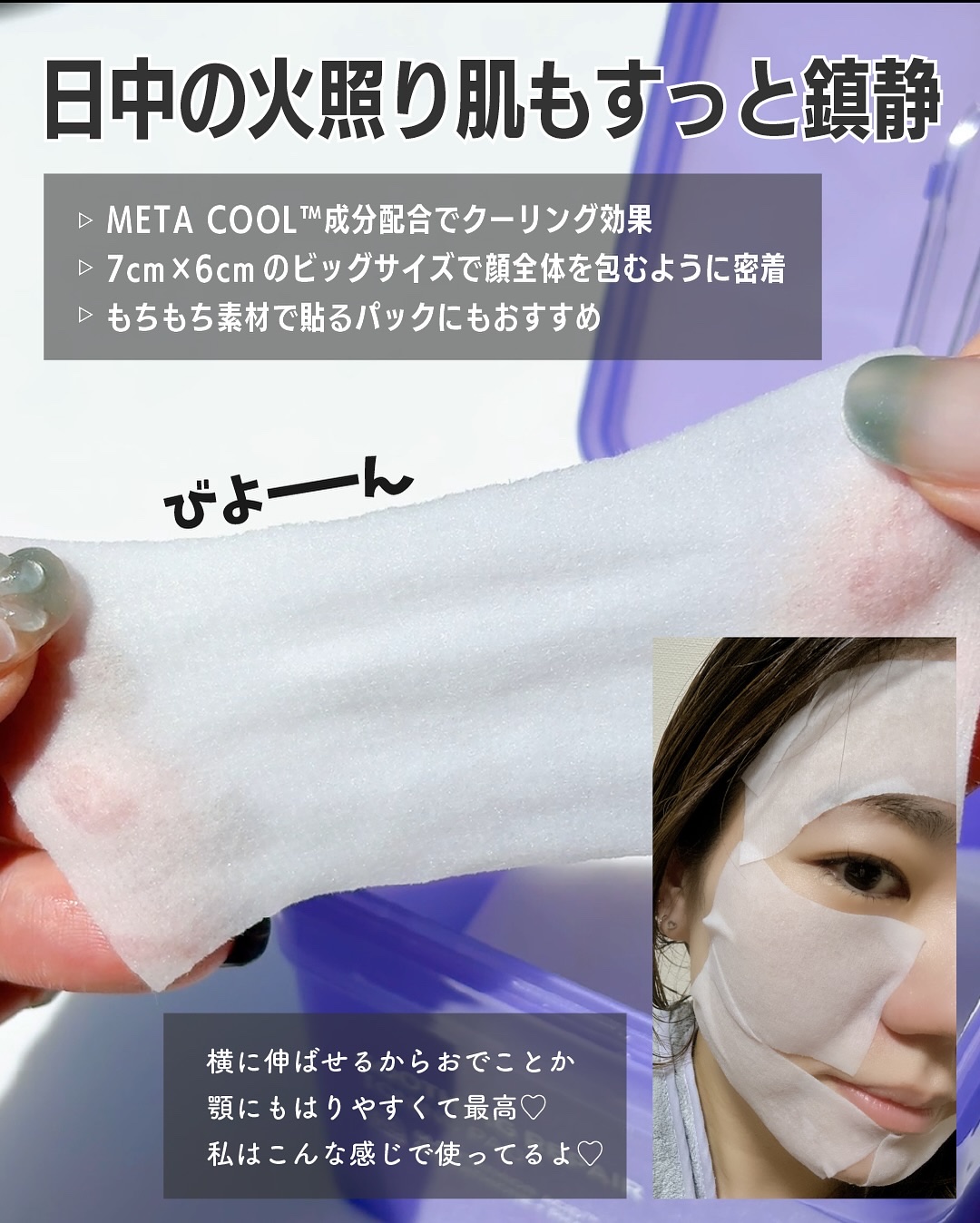グルタチオン ナイアシンアミド5% ビタミンC・E ジェリー面とガーゼ面の構成 エッセンスたっぷり含んでるっていうかジェリー面にエッセンスくっついてる。(伝わってほしいw) ガーゼ面はやっさしい肌触りで拭き取り♡ 肌の調子いい感じ 次の日もいい感じだったけど、今半分くらい使ってみて、(2週間すぎたくらい?)さらによさを感じてる♡♡♡ 1枚が大きい 私は顔の面積しっかりありますが、4枚目にもあるようにかなり広範囲おおえます! カットして目の下のくすみに貼るのもいいね♡ 私はズボラなので贅沢にカットせず2枚使って両頬に貼って、3分〜5分程度パックしたら額と顎に貼って、最後エラのとこに貼って、、吸い取れるだけ吸い取ってます。笑