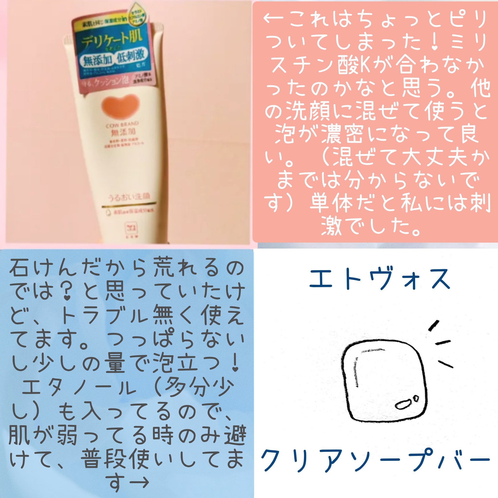 洗浄力がかなり低いのに、洗い上がりの重さや嫌に残る感じはなくて、つるんって軽やかな感じ。 クレンジング後でもつっぱりにくいです◎ セララボはそれより洗浄力低くて、洗い上がりもちょっとだけ軽やかな感じがしました。冬はつっぱるの回避したいから、個人的にはセララボ使いたくなるかも✍🏻 低刺激なので、花粉でお肌が揺らぎやすい今の時期にも良いのではないかと思います🫶🏻