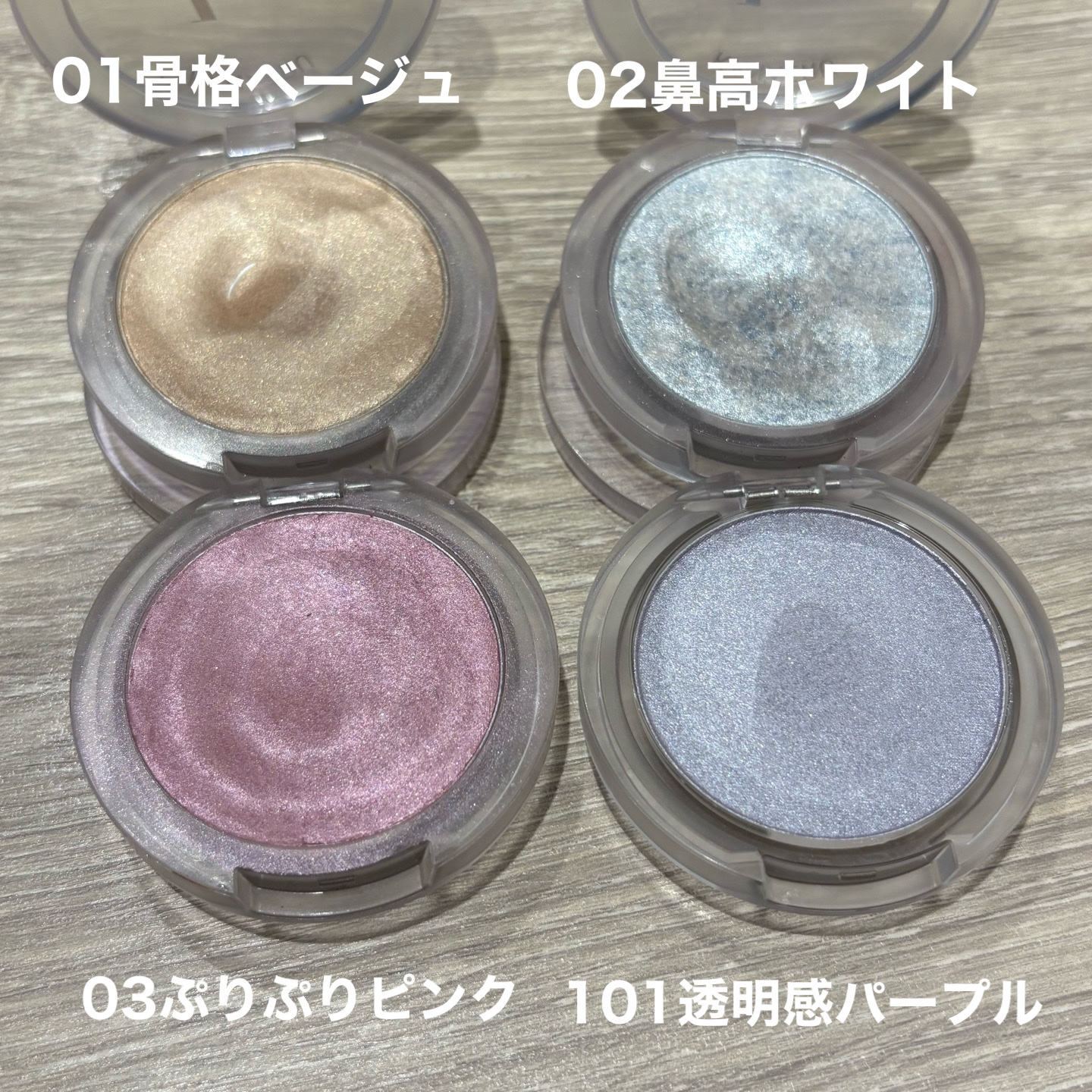 - b idolから新定番! 私にかける、魔法の光。 叶えるハイライト \立体感*血色*透明感/ 欲しいところにプラスする、シルキータッチなハイライト 骨格ベージュで顔全体をフラットになじませて、 鼻高ホワイトで鼻筋や額、高く見せたい所にポイント使い♪ ぷりぷりピンクはチーク使いでかわいく仕込む♡ お肌のことを考えた美容成分*配合なので使いやすい◎ マルチに使える3色展開!コンパクトなのでもち運びにもとっても便利。 *ティーツリー葉油、ヒアルロン酸Na、セラミドNP(全て保湿成分) <01 骨格ベージュ> 自然に溶け込む立体ベージュ <02 鼻高ホワイト> 透明感をひきあげるポイントマーブル <03 ぷりぷりピンク> やわらかな丸みを仕込む血色ピンク ※全てメイクアップ効果