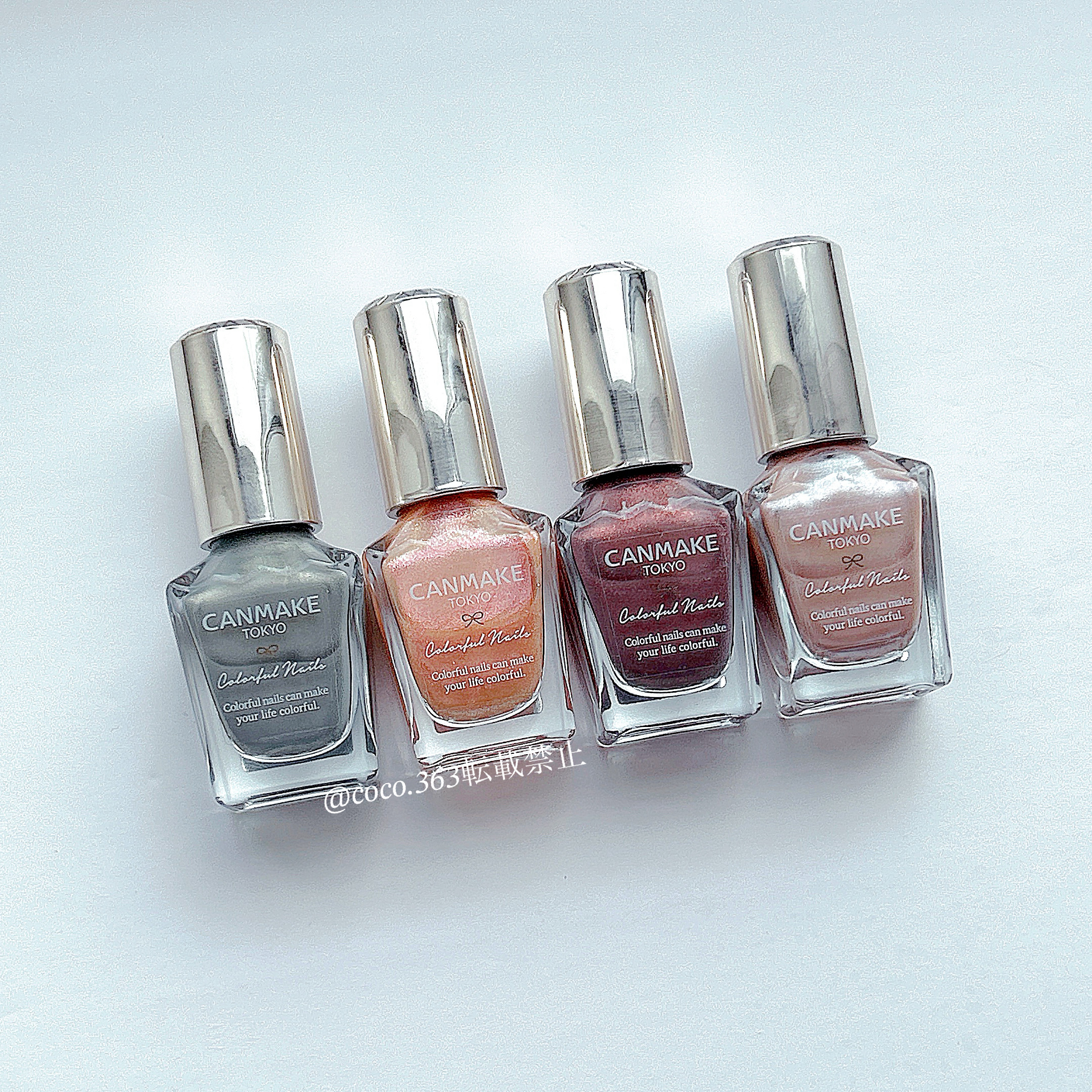 - <N02 シックボルドー> 酢酸ブチル、酢酸エチル、ニトロセルロース、(アジピン酸/ネオペンチルグリコール/無水トリメリト酸)コポリマー、クエン酸アセチルトリブチル、イソプロパノール、アクリレーツコポリマー、ステアラルコニウムベントナイト、酸化鉄、ブタノール、オキシベンゾン-1、シリカ、赤220、ジアセトンアルコール、酸化チタン、リン酸、カーボンブラック、ジ安息香酸トリメチルペンタンジイル、黄4、赤226 [旧]酢酸ブチル、酢酸エチル、ニトロセルロース、(アジピン酸/ネオペンチルグリコール/無水トリメリト酸)コポリマー、クエン酸アセチルトリブチル、イソプロパノール、アクリレーツコポリマー、ステアラルコニウムベントナイト、(スチレン/アクリレーツ)コポリマー、酸化鉄、ブタノール、シリカ、オキシベンゾン-1、赤220、ジアセトンアルコール、酸化チタン、ジ安息香酸トリメチルペンタンジイル、リン酸、カーボンブラック、黄4 <N08 ミスティモーヴ> 酢酸ブチル、酢酸エチル、ニトロセルロース、(アジピン酸/ネオペンチルグリコール/無水トリメリト酸)コポリマー、クエン酸アセチルトリブチル、イソプロパノール、アクリレーツコポリマー、ステアラルコニウムベントナイト、酸化チタン、ブタノール、シリカ、オキシベンゾン-1、マンガンバイオレット、ジアセトンアルコール、酸化鉄、赤226、リン酸、カオリン、ジ安息香酸トリメチルペンタンジイル、黄4 [旧] 酢酸ブチル、酢酸エチル、ニトロセルロース、(アジピン酸/ネオペンチルグリコール/無水トリメリト酸)コポリマー、クエン酸アセチルトリブチル、イソプロパノール、アクリレーツコポリマー、ステアラルコニウムベントナイト、(スチレン/アクリレーツ)コポリマー、酸化チタン、ブタノール、オキシベンゾン-1、シリカ、酸化鉄、ジアセトンアルコール、マンガンバイオレット、ジ安息香酸トリメチルペンタンジイル、リン酸、カーボンブラック、黄4 <N10 ペールラベンダー> 酢酸ブチル、酢酸エチル、ニトロセルロース、(アジピン酸/ネオペンチルグリコール/無水トリメリト酸)コポリマー、クエン酸アセチルトリブチル、イソプロパノール、アクリレーツコポリマー、ステアラルコニウムベントナイト、酸化チタン、ブタノール、酸化鉄、オキシベンゾン-1、シリカ、ジアセトンアルコール、マンガンバイオレット、リン酸、ジ安息香酸トリメチルペンタンジイル、黄4、赤226 [旧]酢酸ブチル、酢酸エチル、ニトロセルロース、(アジピン酸/ネオペンチルグリコール/無水トリメリト酸)コポリマー、クエン酸アセチルトリブチル、イソプロパノール、アクリレーツコポリマー、ステアラルコニウムベントナイト、酸化チタン、ブタノール、シリカ、オキシベンゾン-1、ジアセトンアルコール、酸化鉄、ジ安息香酸トリメチルペンタンジイル、マンガンバイオレット、リン酸、黄4 <N12 アーモンドグリーン> 酢酸ブチル、酢酸エチル、ニトロセルロース、(アジピン酸/ネオペンチルグリコール/無水トリメリト酸)コポリマー、クエン酸アセチルトリブチル、イソプロパノール、アクリレーツコポリマー、ステアラルコニウムベントナイト、(スチレン/アクリレーツ)コポリマー、酸化チタン、ブタノール、シリカ、オキシベンゾン-1、ジアセトンアルコール、ジ安息香酸トリメチルペンタンジイル、黄4、カーボンブラック、リン酸、コンジョウ <N16 ココア> 酢酸ブチル、酢酸エチル、ニトロセルロース、(アジピン酸/ネオペンチルグリコール/無水トリメリト酸)コポリマー、クエン酸アセチルトリブチル、イソプロパノール、酸化チタン、アクリレーツコポリマー、ステアラルコニウムベントナイト、酸化鉄、ブタノール、シリカ、オキシベンゾン-1、ジアセトンアルコール、黄4、リン酸、ジ安息香酸トリメチルペンタンジイル、カーボンブラック、赤226 [旧]酢酸ブチル、酢酸エチル、ニトロセルロース、(アジピン酸/ネオペンチルグリコール/無水トリメリト酸)コポリマー、クエン酸アセチルトリブチル、イソプロパノール、酸化チタン、アクリレーツコポリマー、ステアラルコニウムベントナイト、ブタノール、酸化鉄、シリカ、オキシベンゾン-1、ジアセトンアルコール、ジ安息香酸トリメチルペンタンジイル、黄4、リン酸、カーボンブラック <N17 クリームチャイ> 酢酸ブチル、酢酸エチル、ニトロセルロース、(アジピン酸/ネオペンチルグリコール/無水トリメリト酸)コポリマー、クエン酸アセチルトリブチル、イソプロパノール、アクリレーツコポリマー、ステアラルコニウムベントナイト、(スチレン/アクリレーツ)コポリマー、酸化チタン、ブタノール、シリカ、オキシベンゾン-1、ジアセトンアルコール、ジ安息香酸トリメチルペンタンジイル、酸化鉄、リン酸、黄4、カーボンブラック <N19 スウィートコーラル> 酢酸ブチル、酢酸エチル、ニトロセルロース、(アジピン酸/ネオペンチルグリコール/無水トリメリト酸)コポリマー、クエン酸アセチ