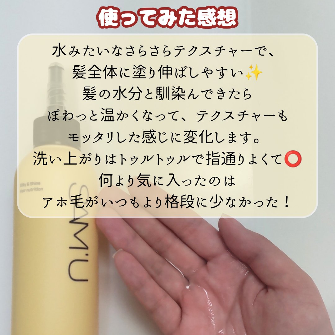 | ヘアケア・スタイリングランキング第9位 | 透明でとろっとしたテクスチャーで髪に伸ばしやすくしっとりツヤ感 でもドライヤーのあとはさらっとしています。 | 詳細を見る | |