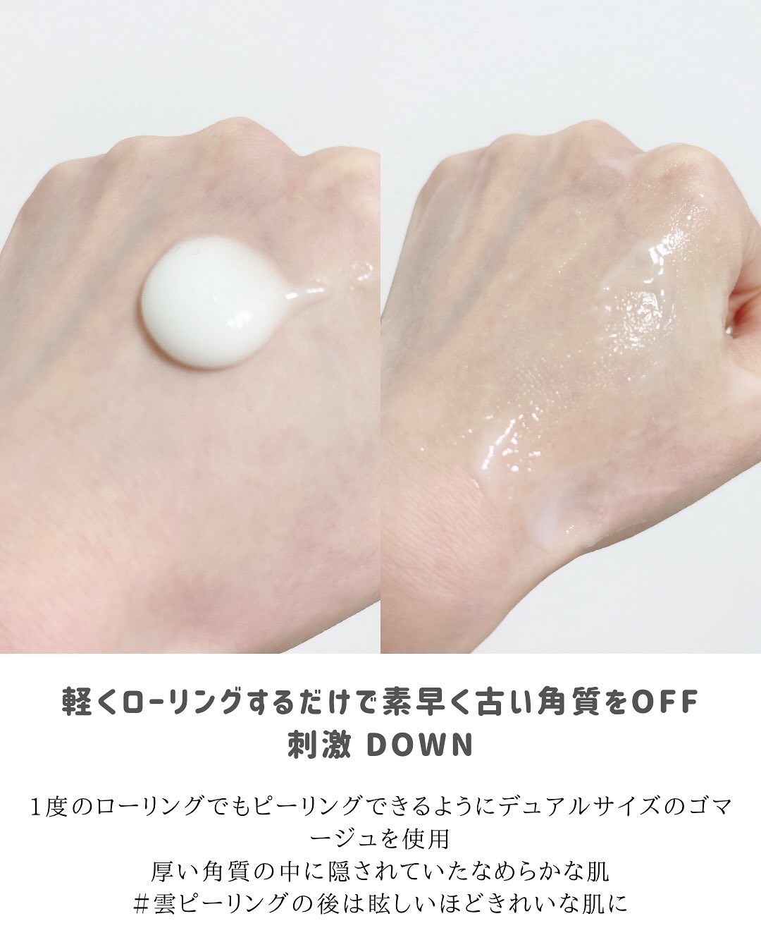 - 透明感溢れるつるすべ肌へ導く水分たっぷりうるふわ雲ピーリング 7種ヒアルロン酸(保湿)を含む雲のようなふんわりテクスチャーが、お肌の古い角質を素早くピーリングケア。 軽くローリングするだけでピーリングが可能なデュアルゴマージュシステムを採用し、肌にやさしい使い心地でピーリングケアを叶えます。 やわらかい雲テクスチャーでピーリング後も肌のうるおいをキープし、ごわついた肌のキメを整えつるすべ肌へと導きます。 臨床テスト完了済みの低刺激ピーリングジェルにより敏感肌の方でも使えます。優しい使用感で角質除去することができます。 (全ての方に皮膚刺激が発生しないということではありません)