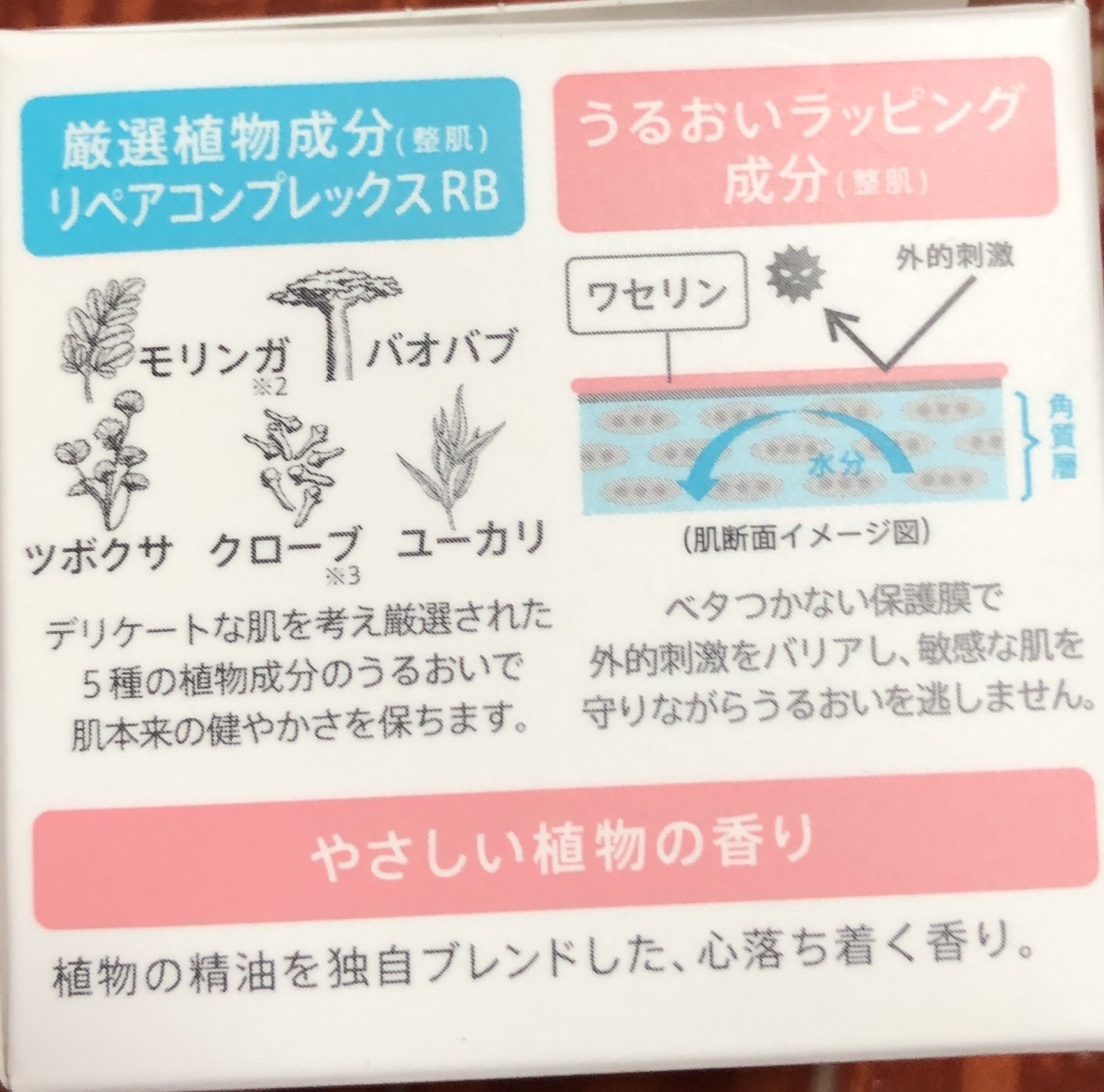 - <45g> 水、BG、ミネラルオイル、エチルヘキサン酸セチル、ステアリン酸グリセリル、ステアリルアルコール、ワセリン、ツボクサ葉エキス、バオバブ種子油、加水分解バオバブエキス、ワサビノキ種子エキス※2、ワサビノキ種子油※2、チョウジエキス※3、チョウジ葉油※3、ユーカリ葉油、セラミドNP、セラミドNG、セラミドAP、ヒアルロン酸Na、バリン、セリン※4、グリシン※4、アルギニン※4、アスパラギン酸※4、PCA※4、アラニン※4、トレオニン※4、プロリン※4、ヒスチジン※4、フェニルアラニン※4、PCA-Na、イソロイシン、異性化糖、乳酸Na、ミツロウ、グリセリン、オレンジ果皮油、ベルガモット果実油、レモン果実油、ライム油、レモングラス油、ローズマリー葉油、ラベンダー油、メボウキ油、ショウズク種子油、ビターオレンジ葉/枝油、アオモジ果実油、カナリヤノキ樹脂油、コリアンダー果実油、ニオイテンジクアオイ油、ポリソルベート60、トリセテス-5リン酸、フェノキシエタノール、ジメチコン、パルミチン酸、カルボマー、水酸化Na、クエン酸、クエン酸Na、BHT、水添レシチン、ダイズステロール、リン酸2Na