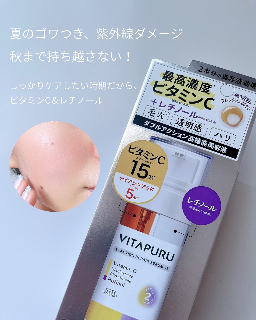 ビタプルダブルアクションリペアセラム15ひと足お先に試させていただきました♡♡特徴は、出した瞬間に初めて混ざりあうセラムだということ!鮮度がとてもいいセラムなんです。ビタミンC誘導体*1も、レチノール誘導体*2も、どちらも繊細で不安...