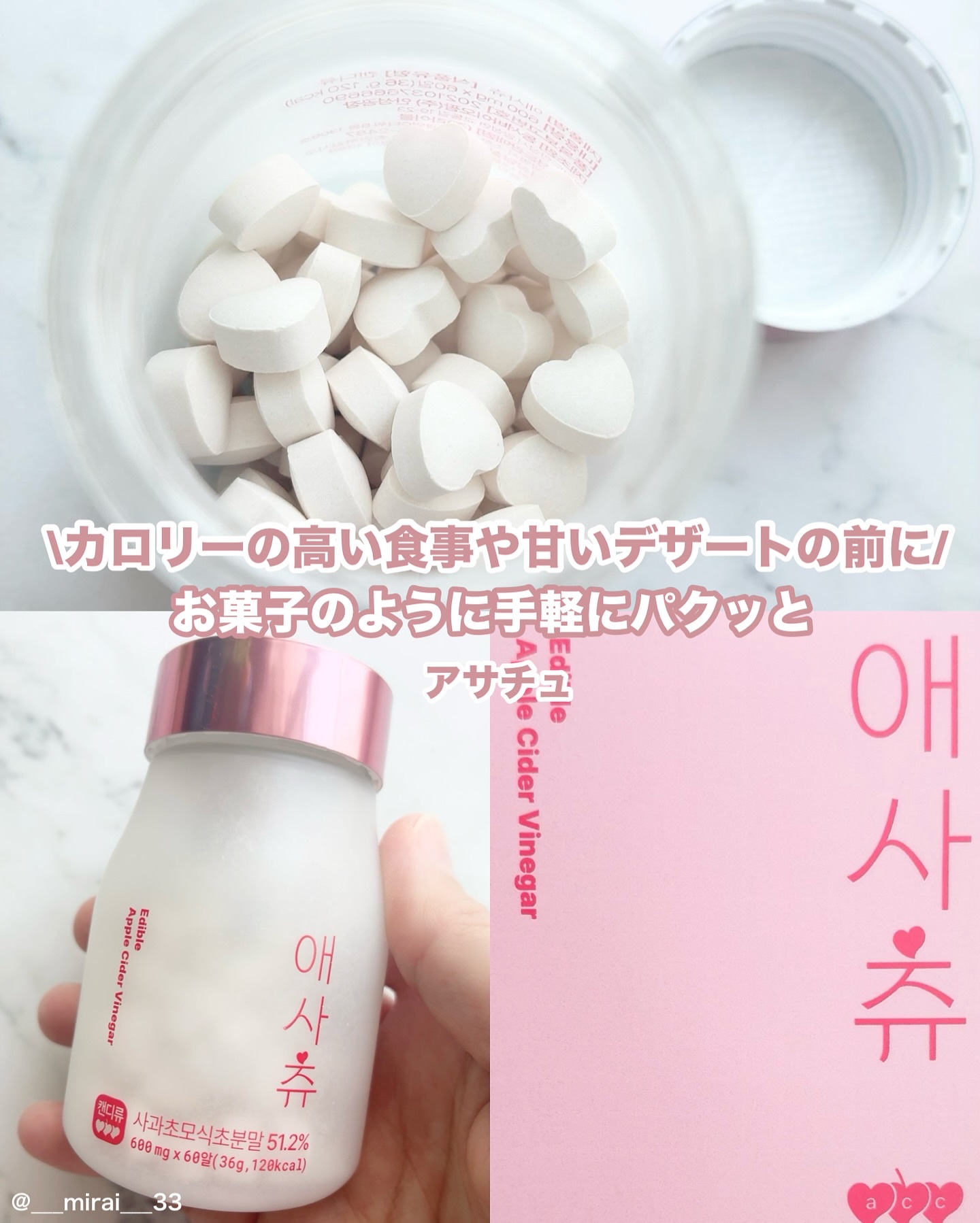 애사츄アサチュアップルサイダービネガーキャンディ60粒入り炭水化物や甘いものを食べる前に!可愛いハート型の小さめのキャンディです🍬1回に3粒目安。3粒で大体りんご酢927mg摂取できるとのこと🍎アルコールや香料を使わずに100%りんごのストレ...