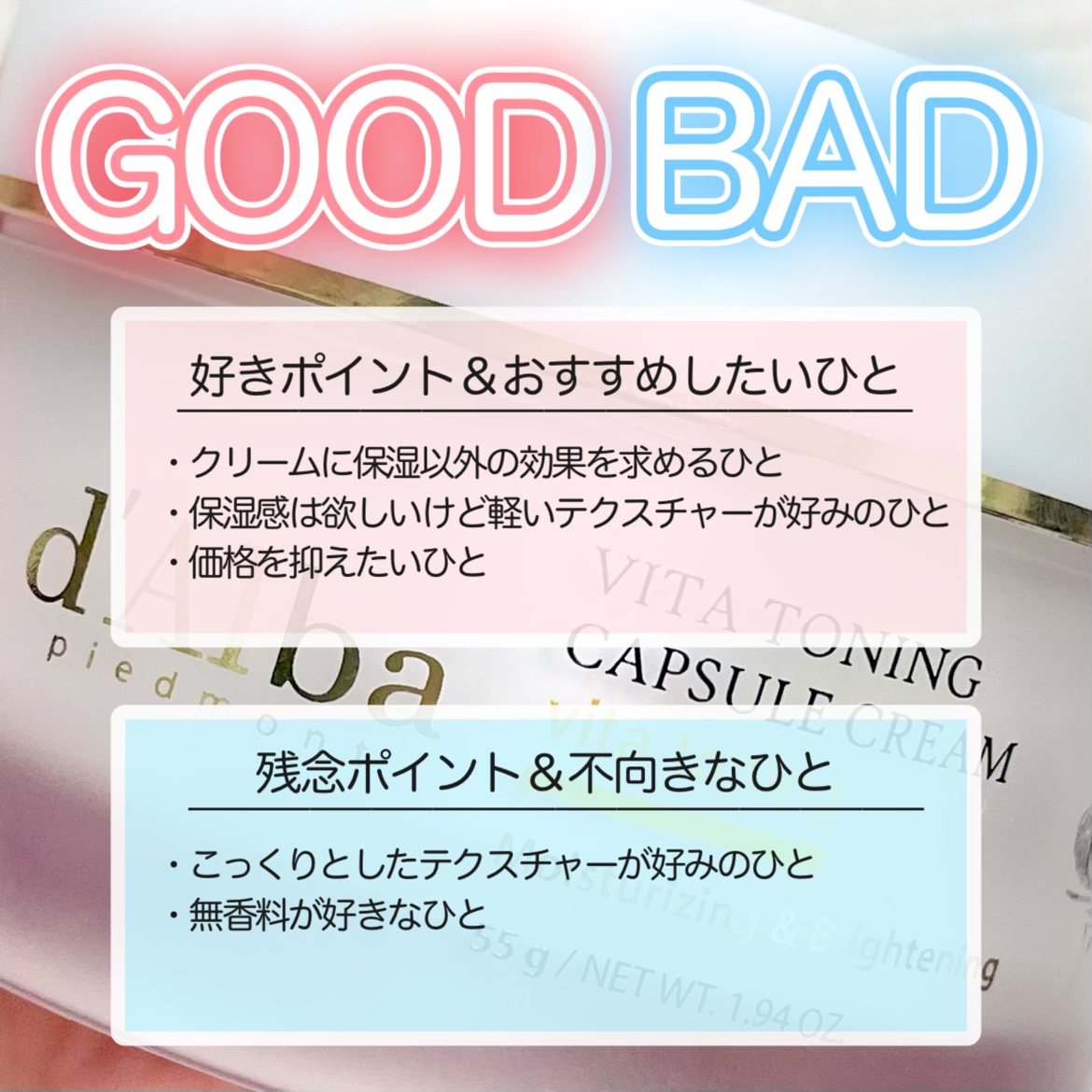 『d'Alba』🔸ビタトーニングカプセルクリームビタミンをたっぷり含んだビタカプセル配合で、柔らかく伸びの良いクリームです!ビタミンCやグルタチオン、ナイアシンアミドも配合されているのでくすみのない透明感のある肌に導いてくれます!なにより、内...
