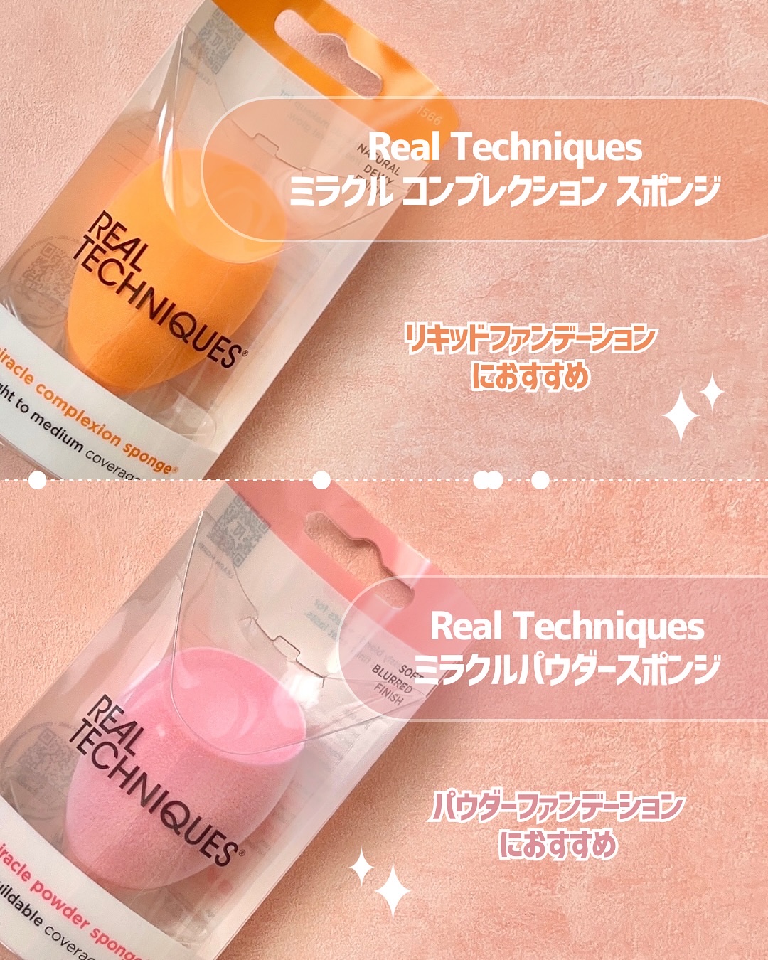 .RealTechniquesミラクルパウダースポンジパウダーファンデーションとセットで使うのにおすすめです◎ヴィーガン処方、ラテックスフリーの多機能スポンジで簡単にプロの仕上がりができるというすぐれもの🎀3つの形状(平らな面・丸い側面...