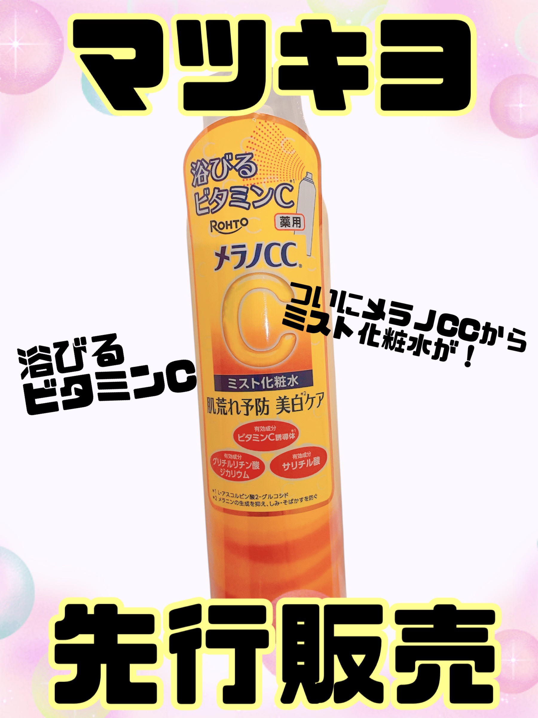 - <メラノCC集中対策薬用ミスト化粧水> 有効成分 L-アスコルビン酸2-グルコシド(ビタミンC誘導体)、グリチルリチン酸ジカリウム、サリチル酸 その他の成分 アスコルビン酸(ビタミンC)、ビタミンE、D-パントテニルアルコール(パンテノール)、レモンエキス、グレープフルーツエキス、アルピニアカツマダイ種子エキス(アルピニアホワイト)、BG、DPG、1、2-ペンタンジオール、濃グリセリン、水酸化K、フェノキシエタノール、シクロヘキサンジカルボン酸ビスエトキシジグリコール、クエン酸ナトリウム水和物、POE・POPデシルテトラデシルエーテル、無水エタノール、無水クエン酸、エデト酸塩、窒素、香料