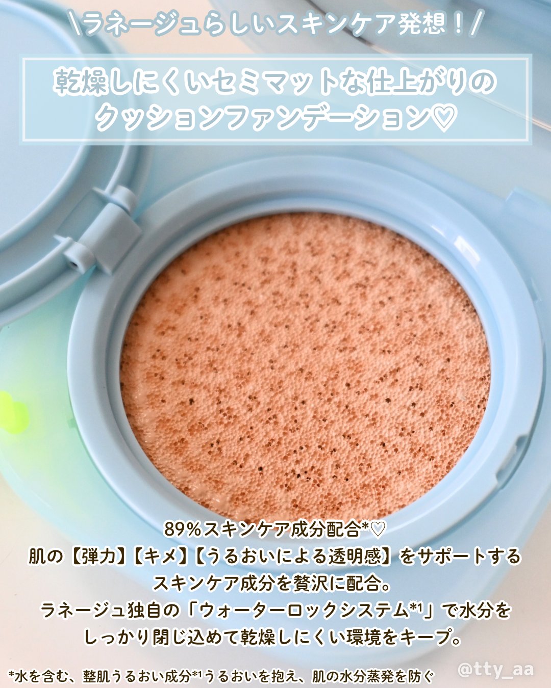 - SPF 42 / PA ++ 2020年のローンチ後、累計販売988個*1を突破したベストセラーネオクッションファンデに、新シリーズが仲間入り!89%スキンケア成分配合*2 ×「エアリーシームレステクノロジー™ 」で崩れにくく、メイクしたての状態がが24時間*3持続。乾燥しにくいセミマットな仕上がりを実現します。 ミラー付きの洗練されたパッケージで、外出先でも手軽にメイク直しができる便利なアイテムです。 *1 2020年~2025年5月グローバル累計販売数量基準 *2 水を含む、いずれも整肌うるおい成分 *3 うるおいを抱え、肌の水分蒸発を防ぐ *4 当社調べ