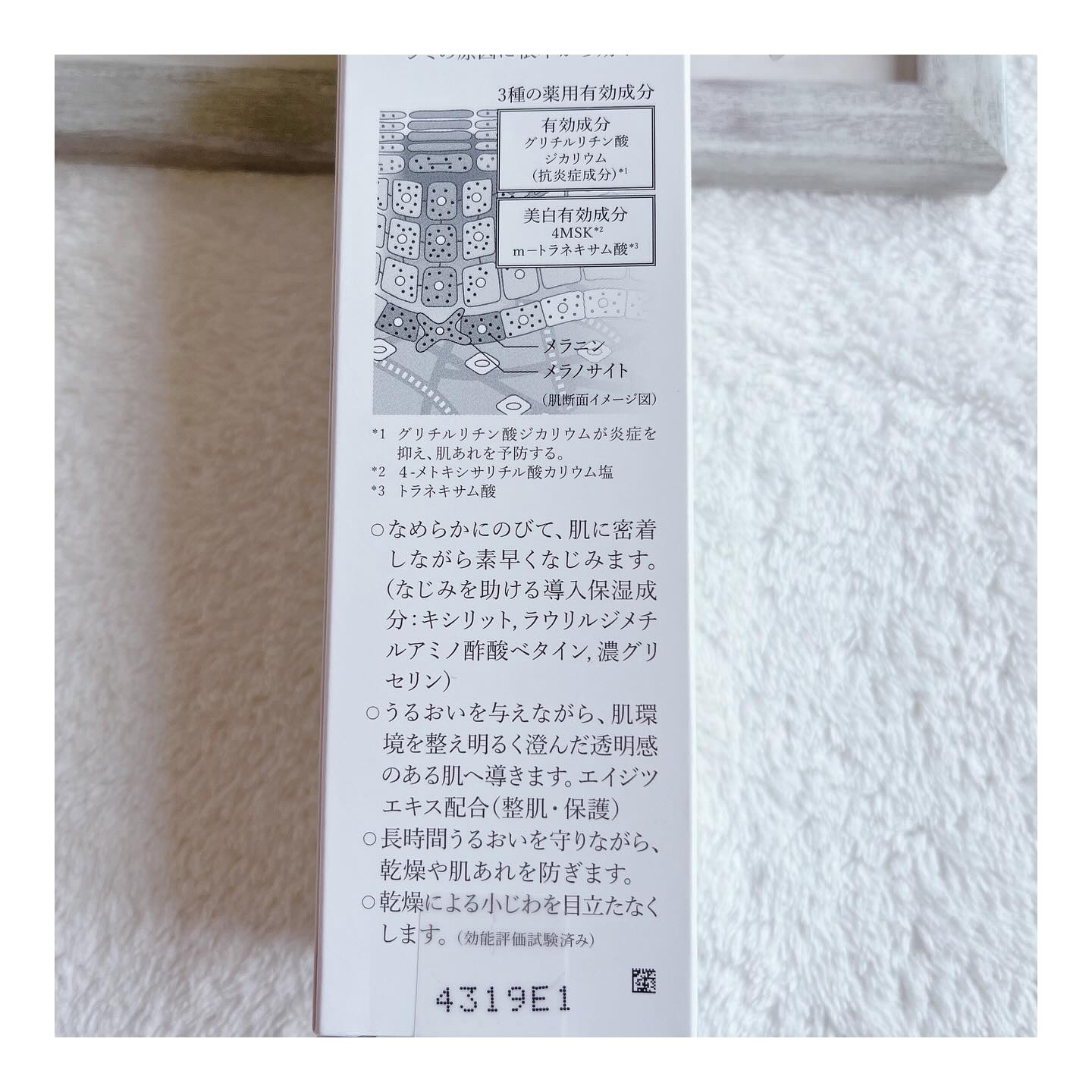 - <45g> 有効成分 4-メトキシサリチル酸カリウム塩、トラネキサム酸、グリチルリチン酸ジカリウム その他の成分 キシリット、ラウリルジメチルアミノ酢酸ベタイン、エイジツエキス、無水ケイ酸、L-セリン、アセチル化ヒアルロン酸ナトリウム、オトギリソウエキス、イチヤクソウエキス、トルメンチラエキス、ユリエキス、塩酸グルコサミン、濃グリセリン、ヨモギエキス(2)、2-O-エチル-L-アスコルビン酸、精製水、ジプロピレングリコール、ベヘニルアルコール、エタノール、メチルポリシロキサン、ジグリセリン、ピバリン酸イソデシル、N-ステアロイル-N-メチルタウリンナトリウム、テトライソブタン、α-オレフィンオリゴマー、ワセリン、ポリエチレングリコール1000、硬化油、ミリスチン酸ミリスチル、ポリオキシエチレン(14)ポリオキシプロピレン(7)ジメチルエーテル、ステアリルアルコール、ポリオキシエチレンベヘニルエーテル、1,3-ブチレングリコール、ステアリン酸ジメチルアミノプロピルアミド、エデト酸二ナトリウム、クエン酸、ジブチルヒドロキシトルエン、無水エタノール、l-メントール、水酸化カリウム、クエン酸ナトリウム、ピロ亜硫酸ナトリウム、フェノキシエタノール <レフィル(45g)> 有効成分 4-メトキシサリチル酸カリウム塩、トラネキサム酸、グリチルリチン酸ジカリウム その他の成分 キシリット、ラウリルジメチルアミノ酢酸ベタイン、エイジツエキス、無水ケイ酸、L-セリン、アセチル化ヒアルロン酸ナトリウム、オトギリソウエキス、イチヤクソウエキス、トルメンチラエキス、ユリエキス、塩酸グルコサミン、濃グリセリン、ヨモギエキス(2)、2-O-エチル-L-アスコルビン酸、精製水、ジプロピレングリコール、ベヘニルアルコール、エタノール、メチルポリシロキサン、ジグリセリン、ピバリン酸イソデシル、N-ステアロイル-N-メチルタウリンナトリウム、テトライソブタン、α-オレフィンオリゴマー、ワセリン、ポリエチレングリコール1000、硬化油、ミリスチン酸ミリスチル、ポリオキシエチレン(14)ポリオキシプロピレン(7)ジメチルエーテル、ステアリルアルコール、ポリオキシエチレンベヘニルエーテル、1,3-ブチレングリコール、ステアリン酸ジメチルアミノプロピルアミド、エデト酸二ナトリウム、クエン酸、ジブチルヒドロキシトルエン、無水エタノール、l-メントール、水酸化カリウム、クエン酸ナトリウム、ピロ亜硫酸ナトリウム、フェノキシエタノール <20g> 有効成分 4-メトキシサリチル酸カリウム塩、トラネキサム酸、グリチルリチン酸ジカリウム その他の成分 キシリット、ラウリルジメチルアミノ酢酸ベタイン、エイジツエキス、無水ケイ酸、L-セリン、アセチル化ヒアルロン酸ナトリウム、オトギリソウエキス、イチヤクソウエキス、トルメンチラエキス、ユリエキス、塩酸グルコサミン、濃グリセリン、ヨモギエキス(2)、2-O-エチル-L-アスコルビン酸、精製水、ジプロピレングリコール、ベヘニルアルコール、エタノール、メチルポリシロキサン、ジグリセリン、ピバリン酸イソデシル、N-ステアロイル-N-メチルタウリンナトリウム、テトライソブタン、α-オレフィンオリゴマー、ワセリン、ポリエチレングリコール1000、硬化油、ミリスチン酸ミリスチル、ポリオキシエチレン(14)ポリオキシプロピレン(7)ジメチルエーテル、ステアリルアルコール、ポリオキシエチレンベヘニルエーテル、1,3-ブチレングリコール、ステアリン酸ジメチルアミノプロピルアミド、エデト酸二ナトリウム、クエン酸、ジブチルヒドロキシトルエン、無水エタノール、l-メントール、水酸化カリウム、クエン酸ナトリウム、ピロ亜硫酸ナトリウム、フェノキシエタノール <レフィルセット25> ベヘニルアルコール、ジグリセリン、フェノキシエタノール、エタノール、ワセリン、濃グリセリン、クエン酸、ステアリルアルコール、無水エタノール、トラネキサム酸、グリチルリチン酸ジカリウム、精製水、ジプロピレングリコール、ポリオキシエチレン(14)ポリオキシプロピレン(7)ジメチルエーテル、メチルポリシロキサン、エデト酸二ナトリウム、ピロ亜硫酸ナトリウム、水酸化カリウム、アセチル化ヒアルロン酸ナトリウム、1,3-ブチレングリコール、クエン酸ナトリウム、キシリット、N-ステアロイル-N-メチルタウリンナトリウム、硬化油、無水ケイ酸、l-メントール、ポリエチレングリコール1000、ミリスチン酸ミリスチル、L-セリン、α-オレフィンオリゴマー、エイジツエキス、4-メトキシサリチル酸カリウム塩、2-O-エチル-L-アスコルビン酸、ラウリルジメチルアミノ酢酸ベタイン、塩酸グルコサミン、ユリエキス、ヨモギエキス(2)、ジブチルヒドロキシトルエン、ポリオキシエチレンベヘニルエーテル、トルメンチラエキス、イチヤクソウエキス、オトギリソウエキス、ピバリン酸イソデシル、ステアリン酸ジメチルアミノプロピルアミド、テトライソブタン