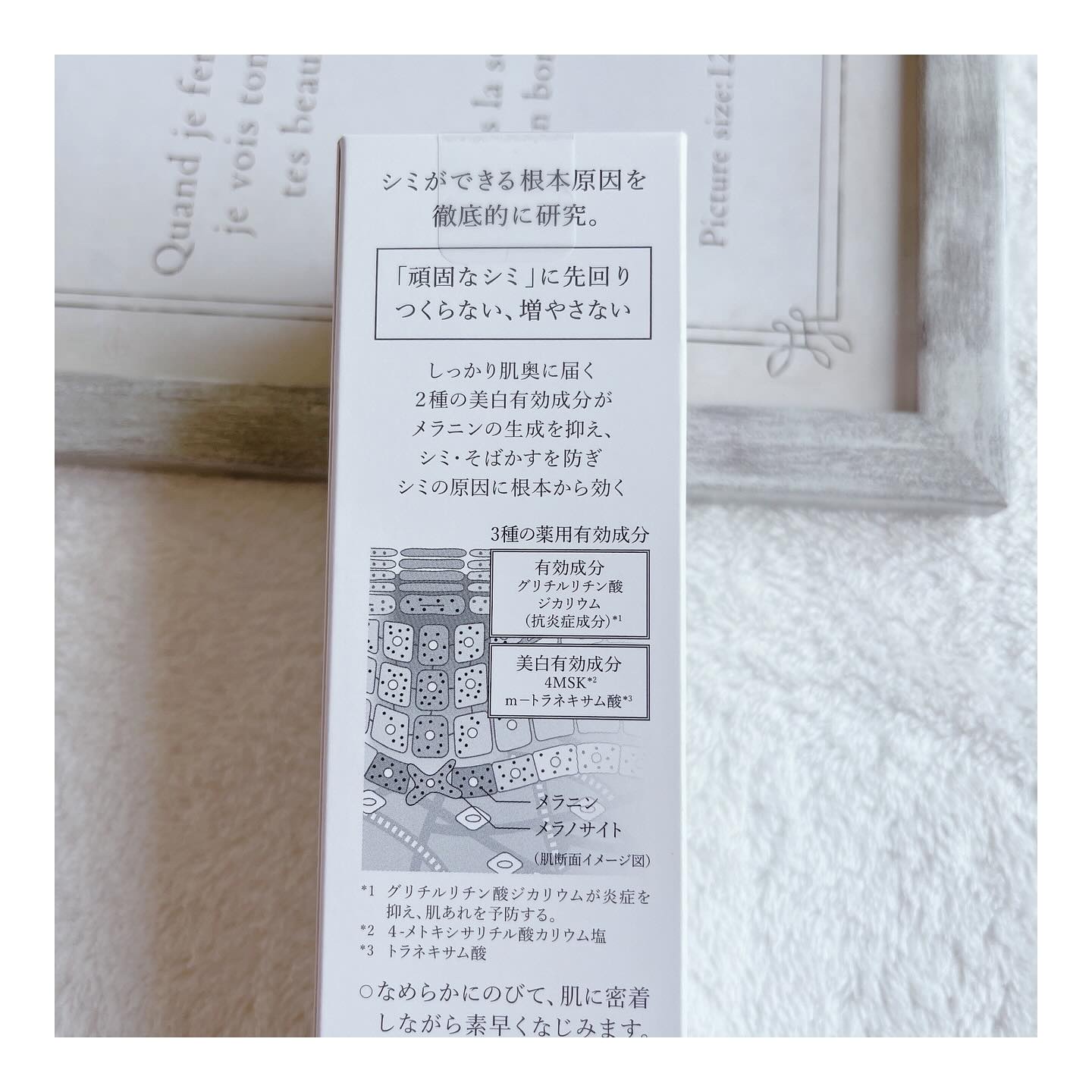- 【医薬部外品】 シミができる根本原因を徹底的に研究。 「頑固なシミ」に先回り。つくらない増やさない。 シミの原因に根本から効かせる2種の美白有効成分(4MSK*、m-トラネキサム酸**)がメラニンの生成を抑え、シミ・そばかすを防ぐ。 有効成分グリチルリチン酸ジカリウムが炎症を抑え、肌あれを予防する。 使用方法: ●朝・夜の化粧水の後に、ディスペンサー2回押し分を手にとり、顔全体に広げます。 ●気になる部分を中心に軽くおさえ、顔全体にていねいになじませます。 使用上注意: ◇日焼け後は、肌の赤みやひりつきがおさまってからお使いください。 ◇使い始めは、中味が出るまでディスペンサーを数回押してください。 ◇ご使用後は、ディスペンサーの口もとをきれいに拭き、キャップをきちんと閉めてください。 ◇気密性を持たせた特殊な内容器を採用しています。使用途中で内容器からディスペンサーを外すと、中味が出なくなることがありますので、取り外さないでください。 ◇直射日光にあたってお肌に異常があらわれたときには、ご使用をおやめください。 ◇日のあたるところや高温のところに置かないでください。 ◇中味の性質上、色の見え方に差が生じる場合がありますが、安心してお使いいただけます。 *4-メトキシサリチル酸カリウム塩 **トラネキサム酸