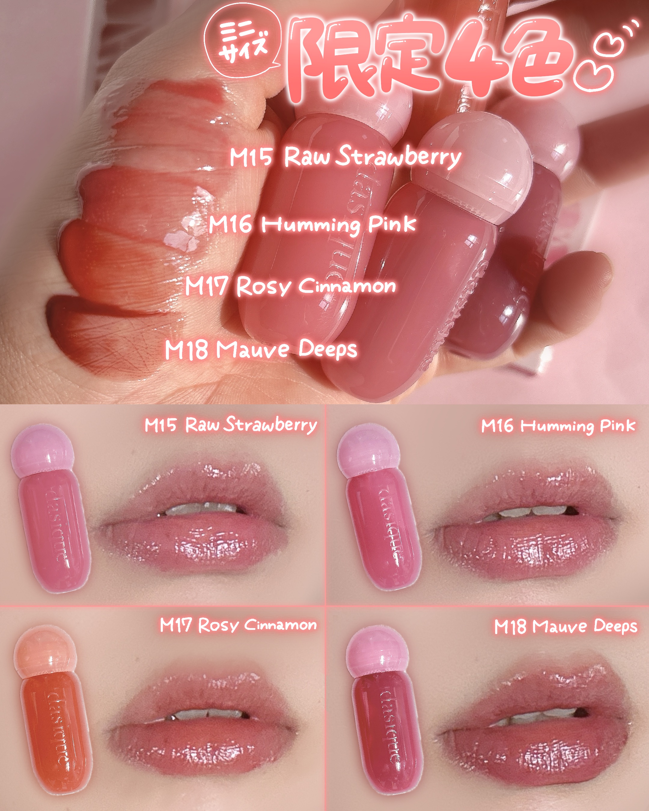 - 【夏新作2カラー登場!】 まるで果実のしずくがそのままリップになったような、みずみずしさと繊細なツヤを詰め込んだ「ジュージーデューイグロウティント」 夏新作で登場する新色「ベリーハート」、「タロミルク」は、透明感とふんわりとした色づきを徹底的にこだわって、何度もテストを重ねて生まれた特別なクールトーンカラー。 ひと塗りで唇をうるおし、重ねても重くならず、果実たっぷり!光をまとうような仕上がりに! - 蜂蜜に漬けた果物のように、うるちゅるふっくらとした果汁粘膜「ジューシーデュイグロウティント」 ミニだけの限定4色 15 ローストロベリー 16 ハミングピンク 17 ロージーシナモン 18 モーブディープス ♡唇に触れた途端、ぷるんと色っぽい果汁コーティング 果汁コーティングがじゅわっと唇に広がり、透明に輝くうるちゅる感を!蜂蜜に漬けた果物のようにぷるんぷるんとした唇を演出するグロウティント ♡イエベ、ブルべに合わせた多彩なカラーバリエーション 14色のカラーバリエーションで単独または、2色レイヤーリングして様々なリップメイクを演出 ♡ティント+リップグロスを一気に塗る効果! ティントの鮮やかな発色とリップグロスのうるうる透明ツヤ感が何度塗り重ねてもべたつかせず、唇にピタッと密着! 2025年11月1日(土)より、Qoo10公式ショップおよび東京フラッグシップストアにて発売予定