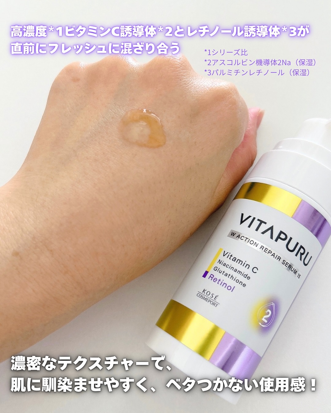 1滴でWのパワー👏2つの美容効果が1本に!【ビタプル ダブルアクションリペアセラム15】2種の美容液が同時に出る2剤式容器を採用。ワンプッシュで1:1※1に吐出されます。ビタミンC誘導体※2も、レチノール誘導体※3も、どちらも繊細で不安定な成...