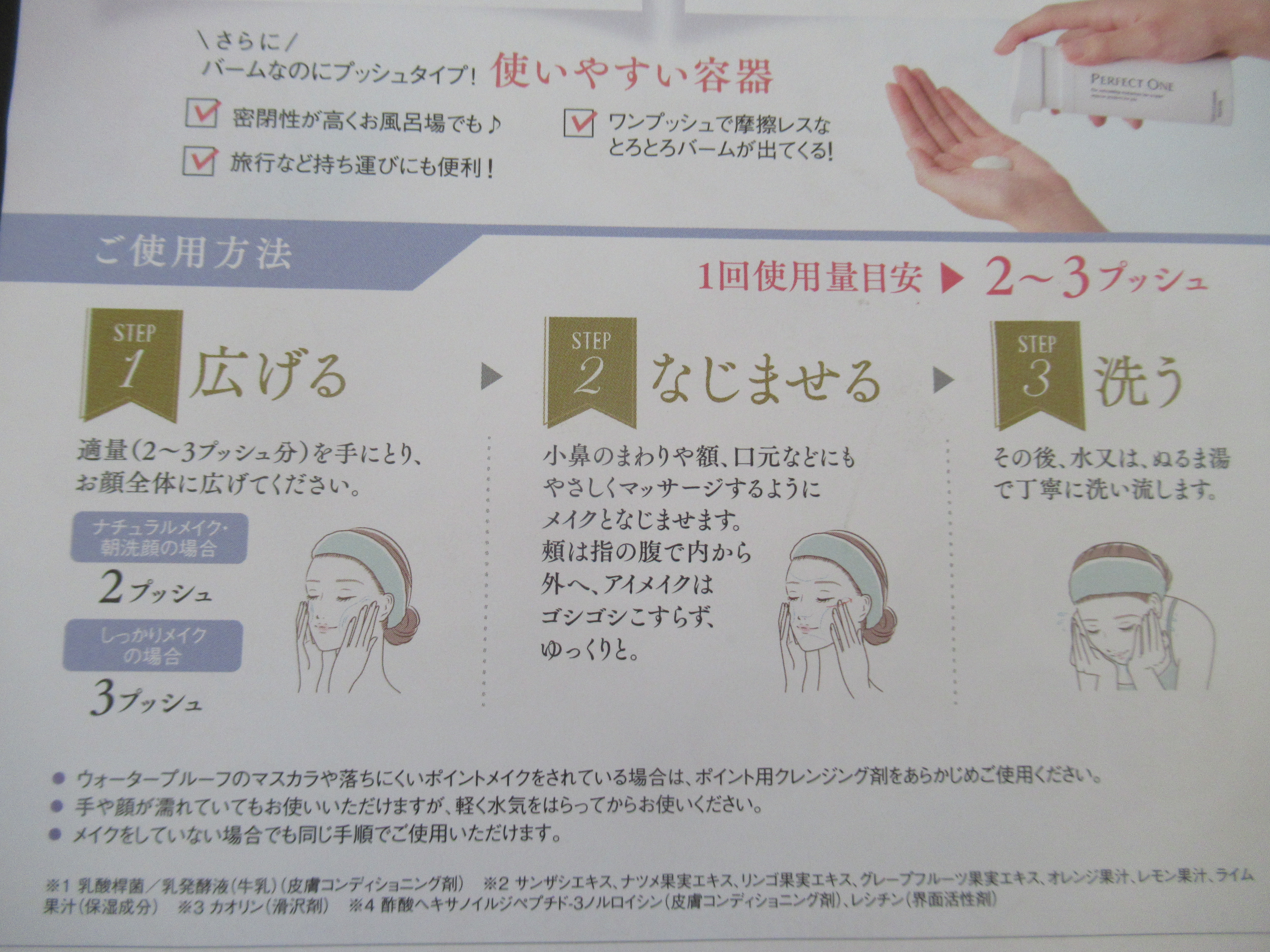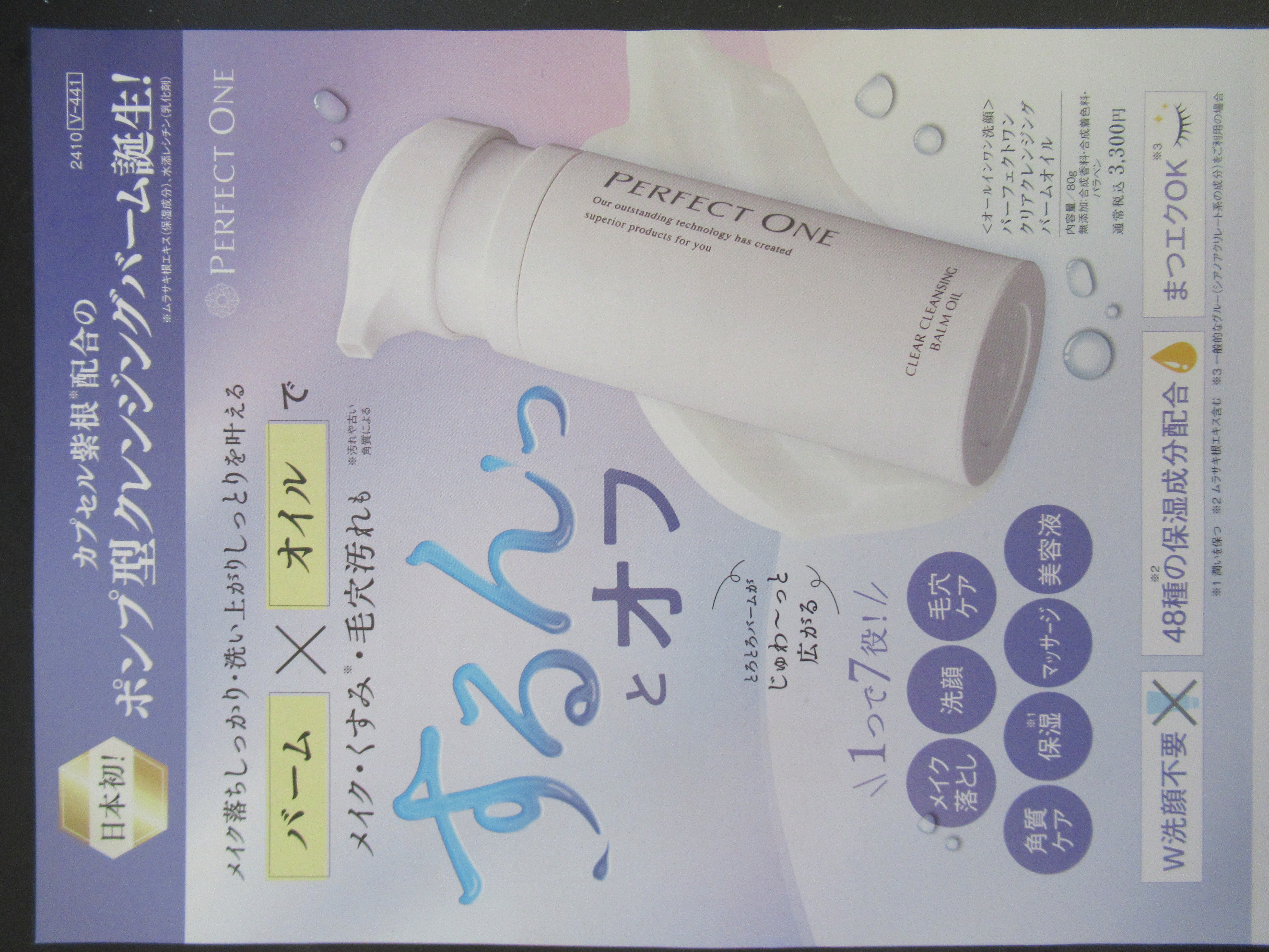 - ・日本初、独自成分配合ポンプ型クレンジングバーム バームの厚みあるテクスチャーとオイルのメイク落ちの高さを1つにした日本初※1の独自成分配合ポンプ型クレンジングバームです。一般的なバームは「カードハウス構造」により、手で崩すことで液状のオイルに変化しますが、新商品はポンプを通る際に崩れる仕組みを採用しました。 ・1本で7つの機能を持つオールインワン洗顔 メイク落とし、洗顔、毛穴ケア、角質ケア、保湿、マッサージ、美容液の7つの機能を1本にしたオールインワン洗顔です。 ・大人くすみを解消 年齢とともに厚くなる角質をケアするリポソームペプチド※3やミルク発酵液※4、ホワイトミネラルクレイ※7などを配合し、クリアな肌へと導きます。 ・濡れた手でも使用でき、W洗顔不要、まつエクOK 一般的なバームは、メイクとなじむ前に水に触れるとメイクが落ちにくくなりますが、「パーフェクトワン クリアクレンジングバームオイル」は、濡れた手でもご使用いただけます。また、W洗顔不要のため摩擦レスで肌への負担を和らげます。さらに、まつエクご使用の方にもご利用いただけます※8。 ・48種の保湿成分配合 『パーフェクトワン』こだわりの成分、複合型コラーゲンEXや、独自研究により開発したカプセル紫根※9、その他、洗い流されない保湿成分※6などを含む48種類の保湿成分を配合。クレンジング後もしっとりした肌へ導きます。 ※1 ポンプで出てくるカプセル紫根配合のクレンジングバームとして日本初(2024年7時点 自社調べ) ※2 年齢に応じたお手入れ ※3 酢酸ヘキサノイルジペプチド-3ノルロイシン(皮膚コンディショニング剤)、レシチン(界面活性剤) ※4 乳酸桿菌/乳発酵液(牛乳)(皮膚コンディショニング剤) ※5 古い角質による ※6 異性化糖(保湿成分) ※7 カオリン(滑沢剤) ※8 一般的なグルー(シアノアクリレート系の成分)をご利用の場合はお使いいただけます。 ※9 ムラサキ根エキス(保湿成分)、水添レシチン(乳化剤) 2024年9月15日(日)~10月15日(火)に楽天公式オンラインショップにて予約販売