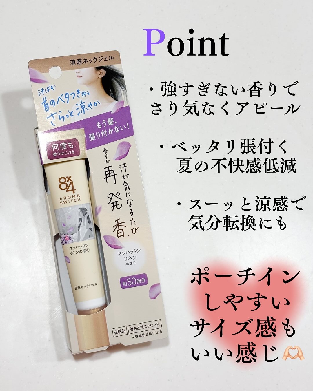 - 首のベタつきを抑え、髪の張り付きを防ぎます 汗が気になるたび、新鮮な香りがはじけてさらっと涼やか ●ジェルが肌をまもって整えます ●汗吸収さらさらパウダー(基剤)配合 肌になじんでドライベールをつくり、さらっと汗を乾かし続けます ●冷涼成分(冷感剤)配合 汗に反応して、ひんやりします ●汗が気になるたび香りが再発香(*2) 汗が気になるたび、新鮮な香りがはじけてあなたを包みます (*2)機能性香料によるカバーリング効果 ●摩擦に強く落ちにくいこすれプルーフ処方 ●携帯に便利なサイズ。約50回使えます ●海外の都市やシーンをイメージした3種類の香り いずれもエッセンシャルオイル配合(香料中)。 マンハッタンリネンの香り:清々しいアイリスにホワイトムスクのアクセント。洗いたてのシーツに包まれて目覚める都会の朝をイメージした香り