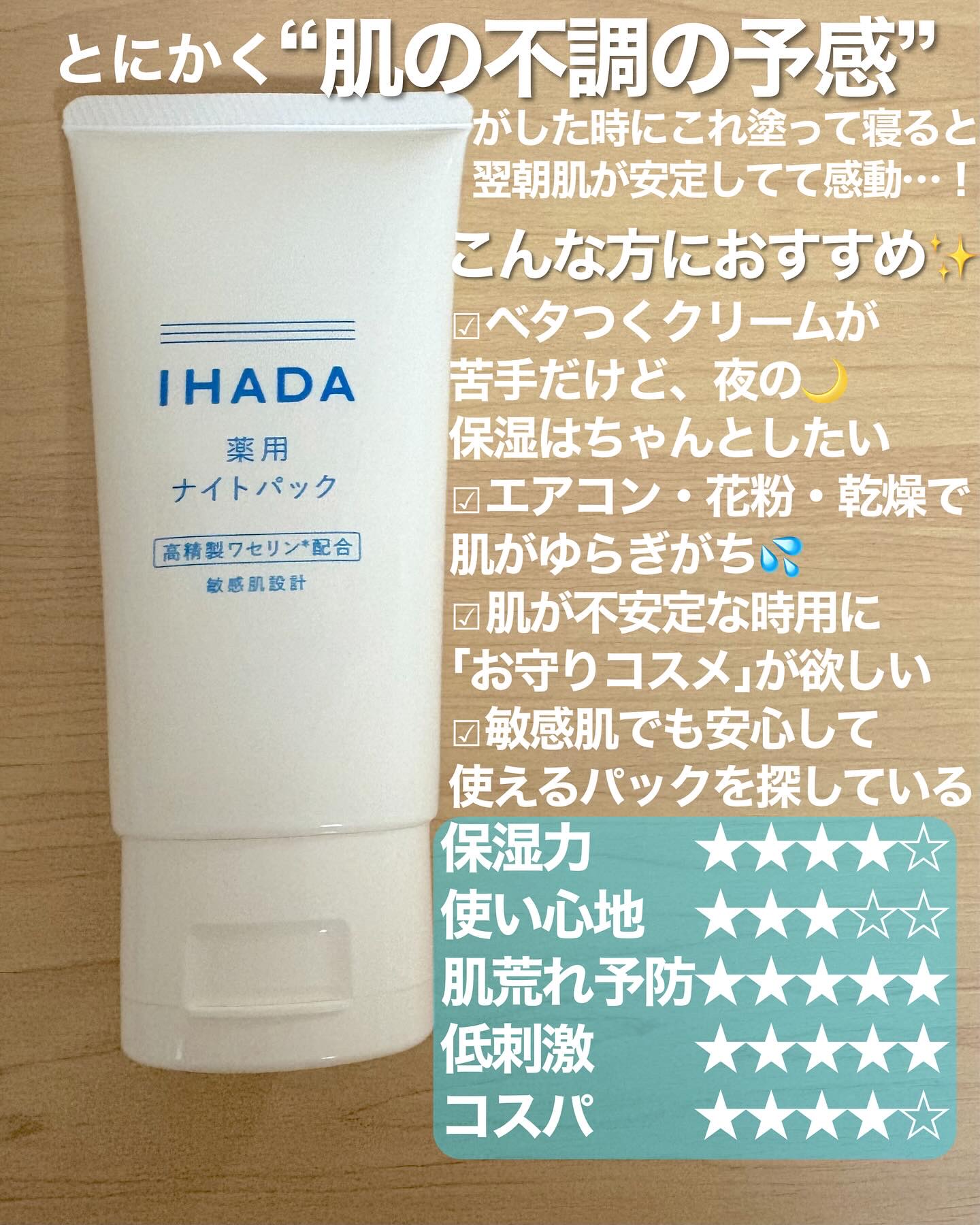 - 【医薬部外品】 新パッケージへリニューアル。 繰り返しがちな肌荒れ・乾燥を防ぐ、夜の集中ケアパックです。 やさしく肌に広がるクリーミーなバームのパックで、べたつかずに一晩中密封してうるおいが続き、翌朝なめらかな肌に整えます。 クリームのなめらかさとバームの密封力を実現したハイブリッドケア処方。 蓄積した、乾燥など日中に受けた肌ダメージ対策に、塗って寝るだけの簡単ケア。 2つの肌荒れ防止有効成分:トラネキサム酸、グリチルリチン酸ジカリウム配合 肌うるおいバリア保護成分:高精製ワセリン配合 うるおいバリア機能を整えながら、角層のすみずみまでうるおいで満たし、すこやかな環境に導きます。 敏感肌設計 ○厳選原料・成分配合 ○パラベン(防腐剤)無添加、アルコール(エチルアルコール)無添加 ○無香料、無着色、弱酸性〇アレルギーテスト済み・ニキビのもとになりにくい処方(全てのかたにアレルギーが起きない、また、ニキビができないわけではありません。) 販売名:イハダ 薬用ナイトバーム ※商品の改良や表示方法の変更などにより、実際の成分と一部異なる場合があります。実際の成分は商品の表示をご覧ください。