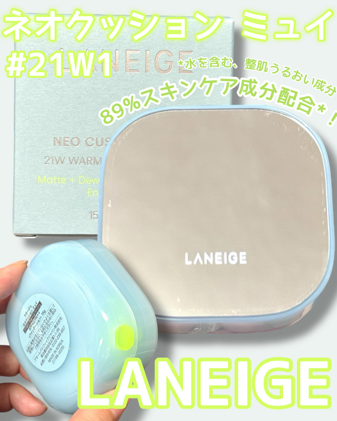 LANEIGEラネージュネオクッションミュイ#21Wウォームベージュ中間色でやや黄みがあり私には暗めでした89%スキンケア成分配合*¹*¹水を含む、整肌うるおい成分・長時間*²乾燥しにくい環境をキープ*²アモーレパシフィック調べ、効果には個人...