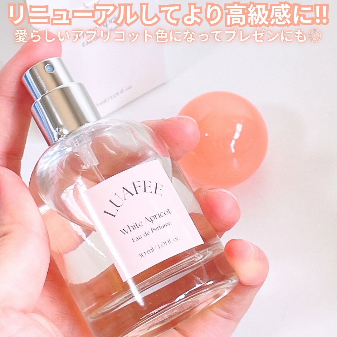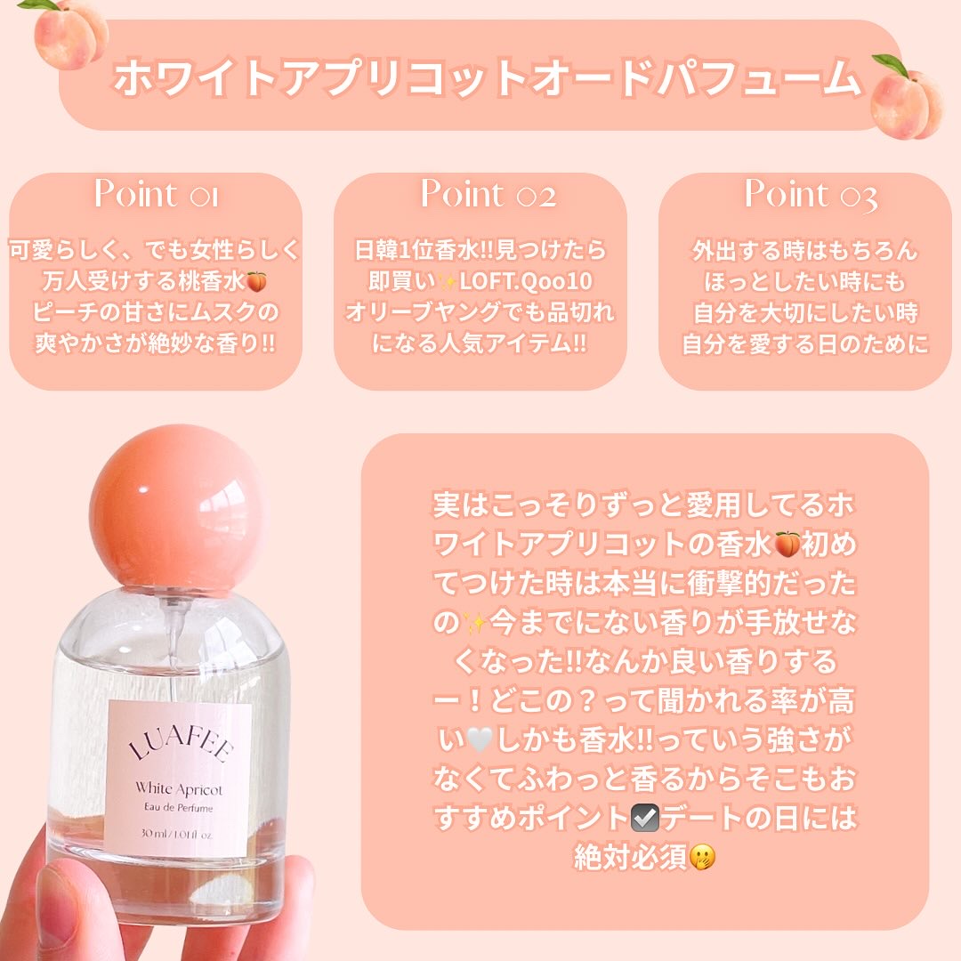 LUAFEEホワイトアプリコットオードパフューム「いい香りですね」って褒められる率、かなり高めの香水…🍑💭ホワイトアプリコットのやさしい桃×ムスクの香りが本当に上品で、ふんわり香る❤︎甘すぎないから普段使いにもぴったりだし、香りの可愛さ...
