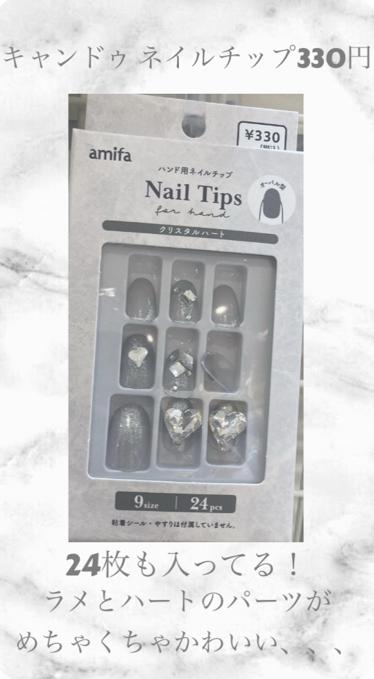 こんにちは!ねんです💅🏻今回はめちゃくちゃかわいいキャンドゥーのネイルチップを紹介します୨୧‥∵‥‥∵‥‥∵‥‥∵‥‥∵‥‥∵‥‥‥∵‥‥∵‥୨୧キャンドゥ amifaネイルチップ330円ラメ感とパーツがめちゃくちゃかわいい、、330円とは思...
